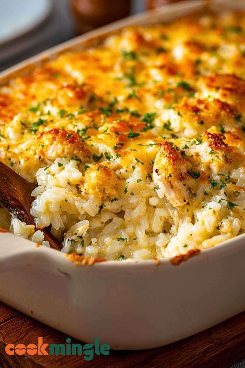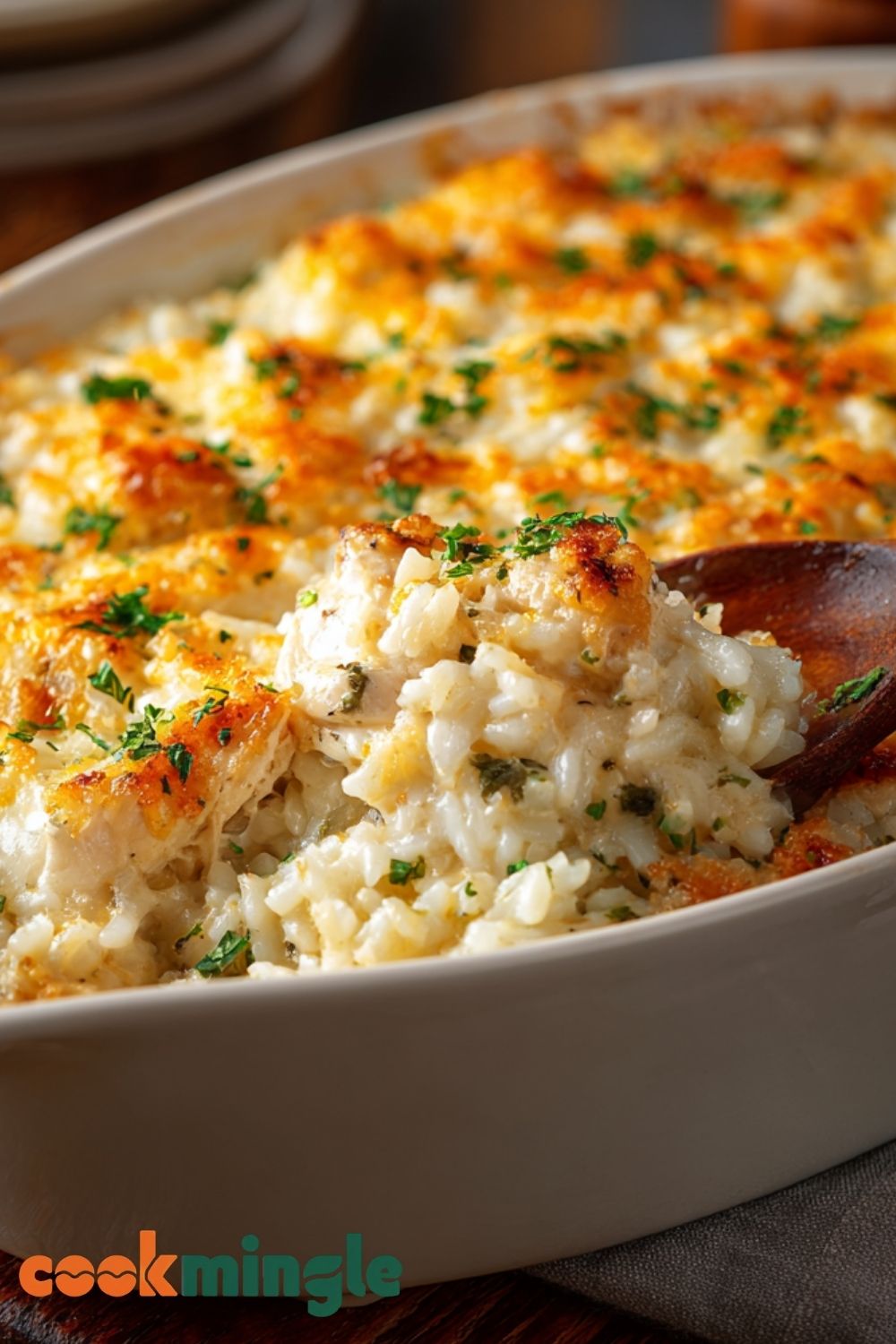 What makes this dish a standout is its perfect balance of flavors and textures. The tender chicken melds perfectly with the creamy rice, while the melted cheese on top adds a lightly crispy contrast. A sprinkle of herbs brings a final pop of freshness, turning a humble casserole into something truly special. It’s hearty, satisfying, and incredibly easy to put together with pantry staples.
