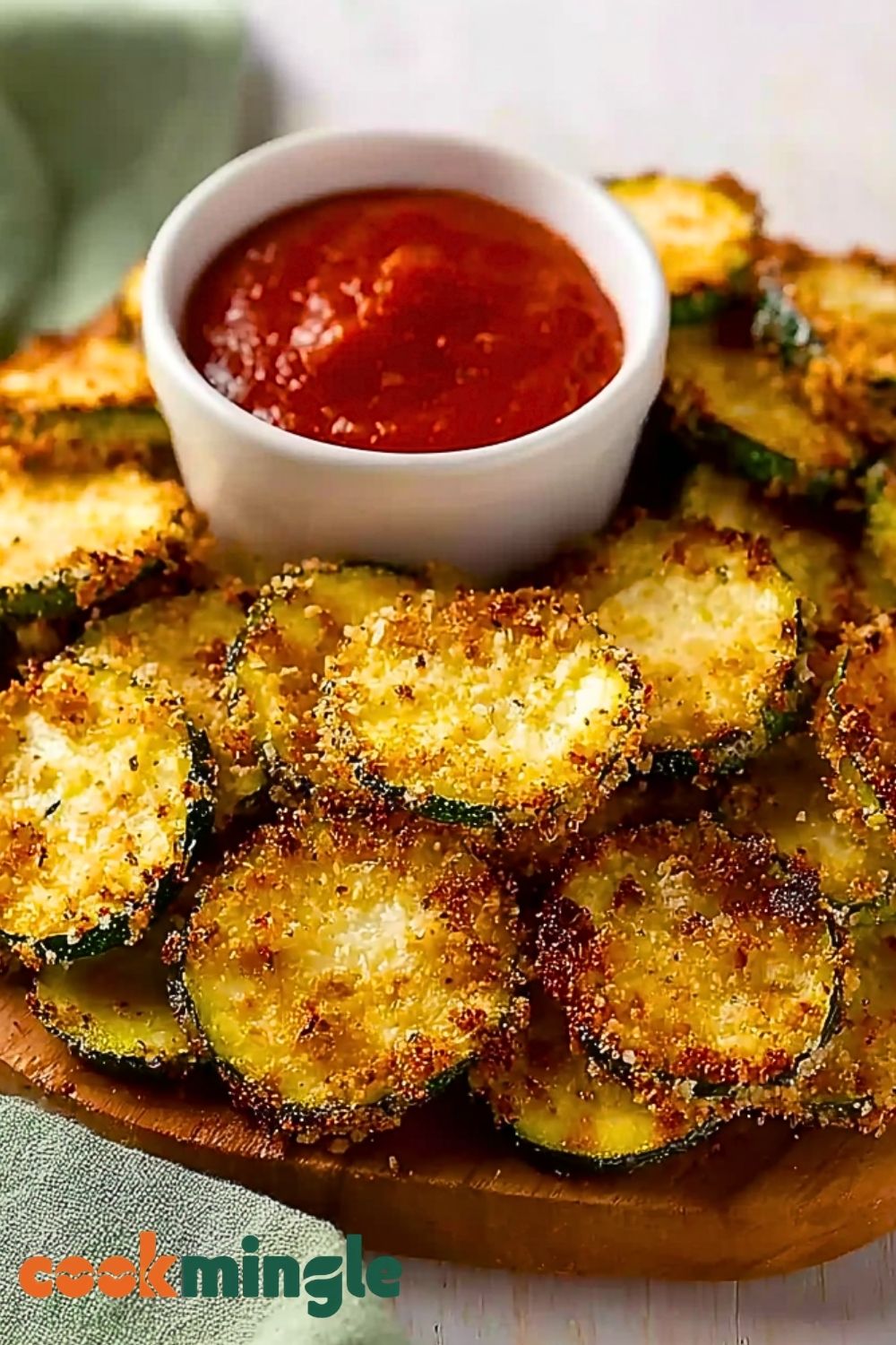 Air fry the zucchini chips at 400°F for 8 to 10 minutes, flipping halfway through. Watch closely in the final minutes to avoid burning. Chips should be golden brown and crispy on the outside, tender inside.