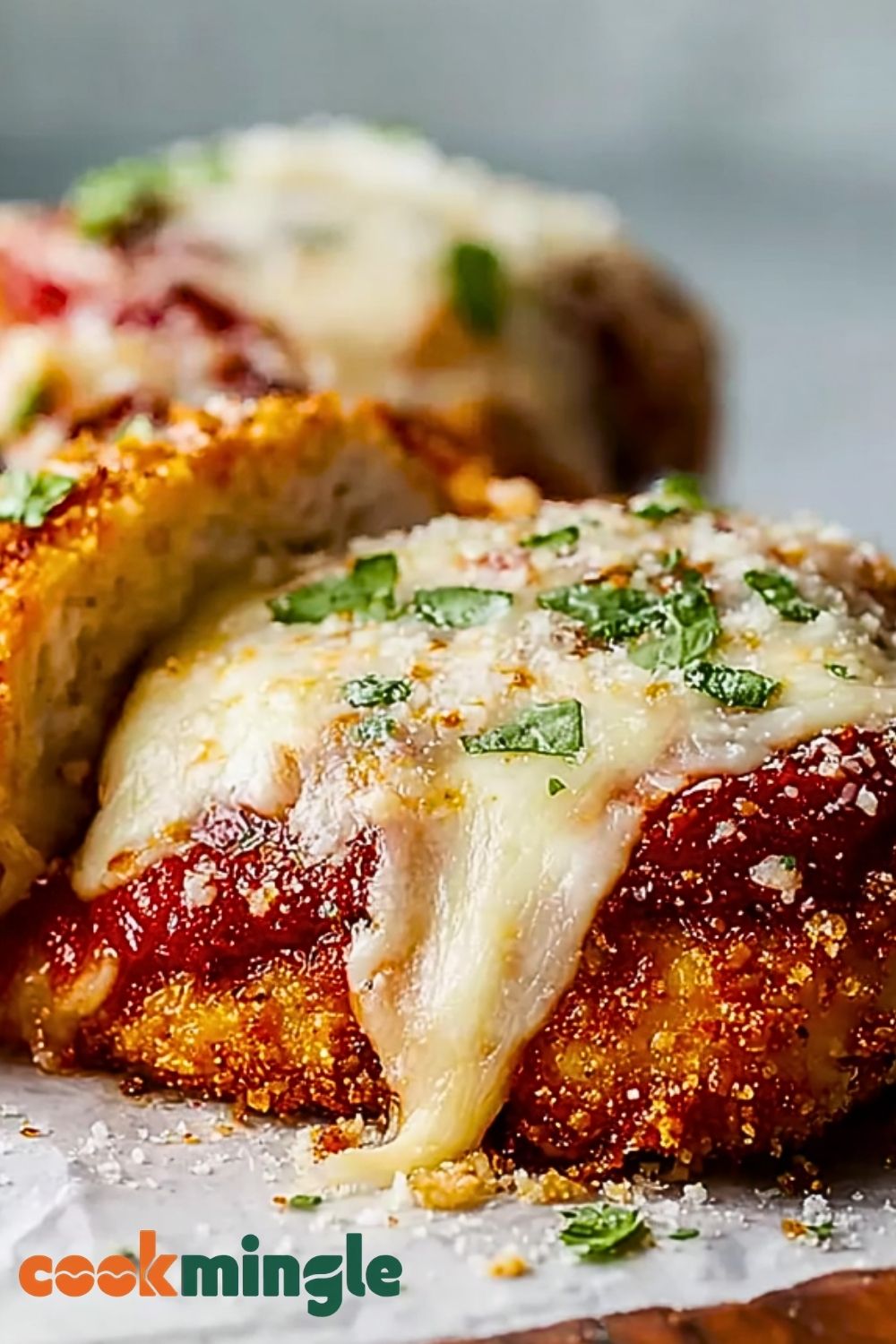Preheat your oven to 425°F (220°C). Place the fried chicken cutlets on a baking sheet or oven-safe dish. Spoon marinara sauce over each cutlet, then top generously with shredded mozzarella and a sprinkle of Parmesan.