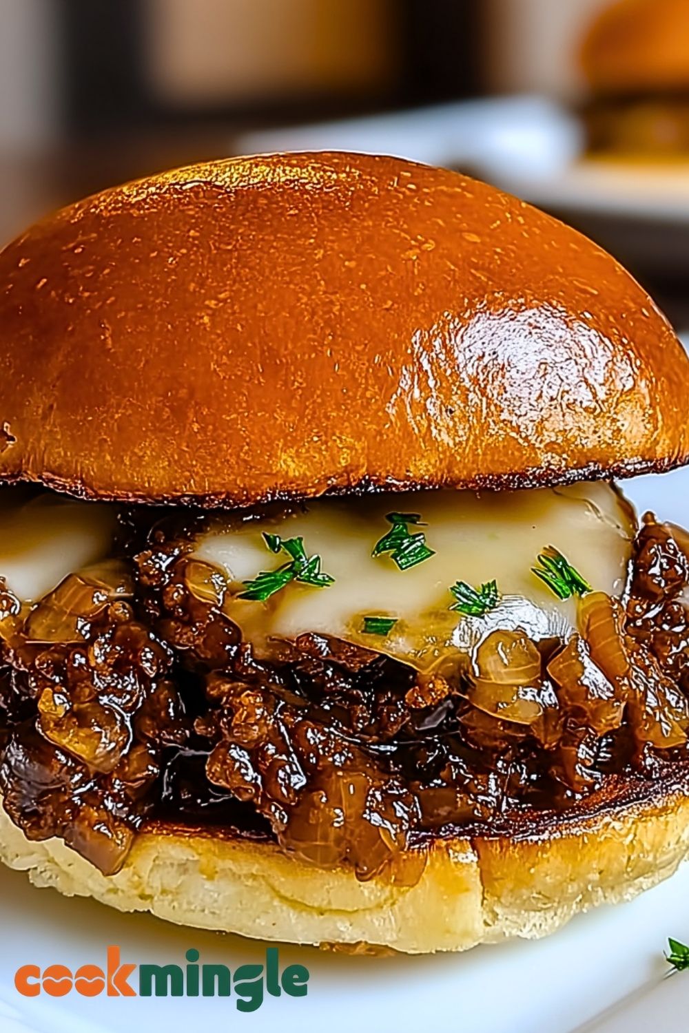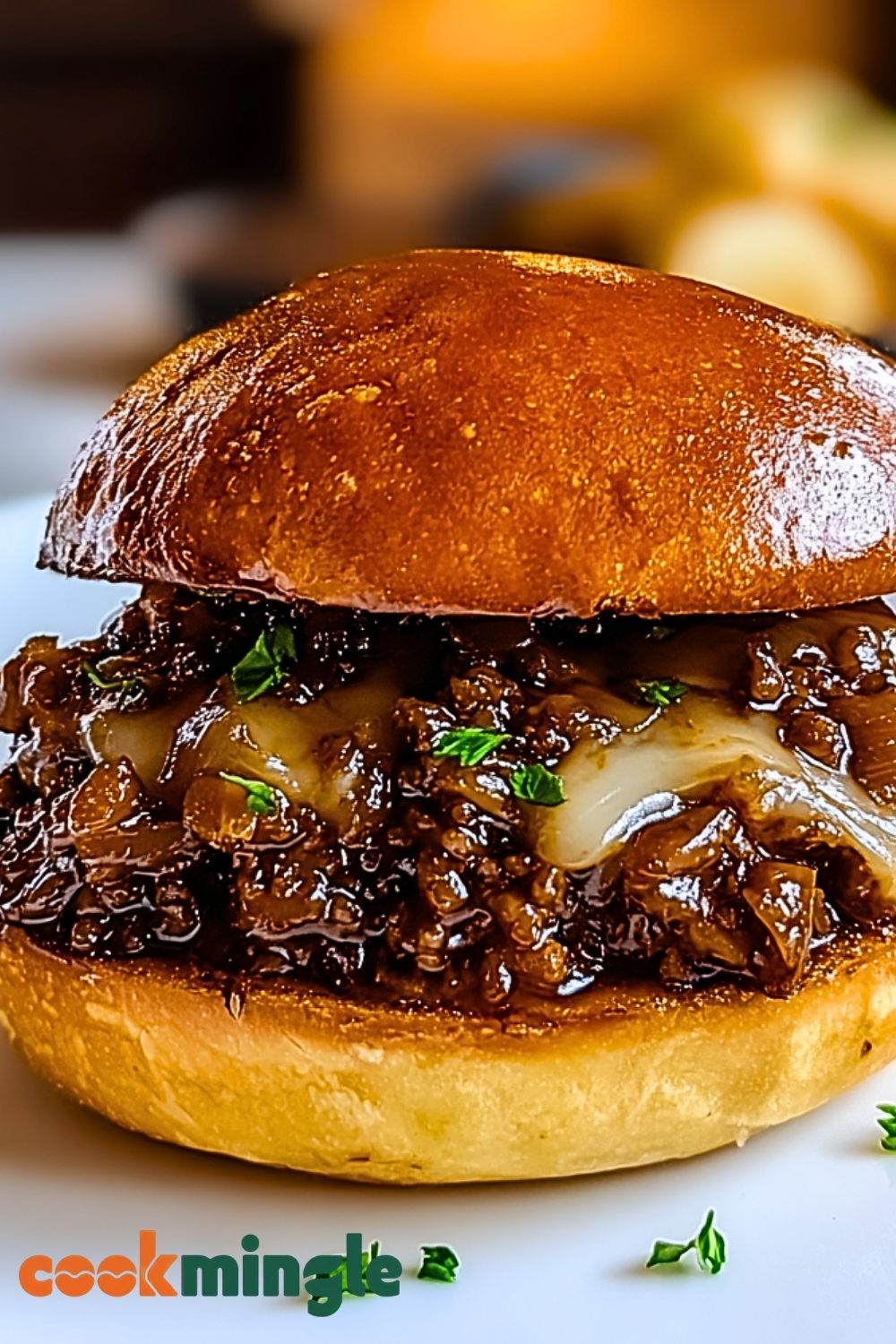 Scoop a generous portion of the beef mixture onto the bottom bun, top it off, and serve immediately while everything is hot and melty. Optionally, garnish with chopped parsley or a light spread of Dijon mustard for an extra kick.