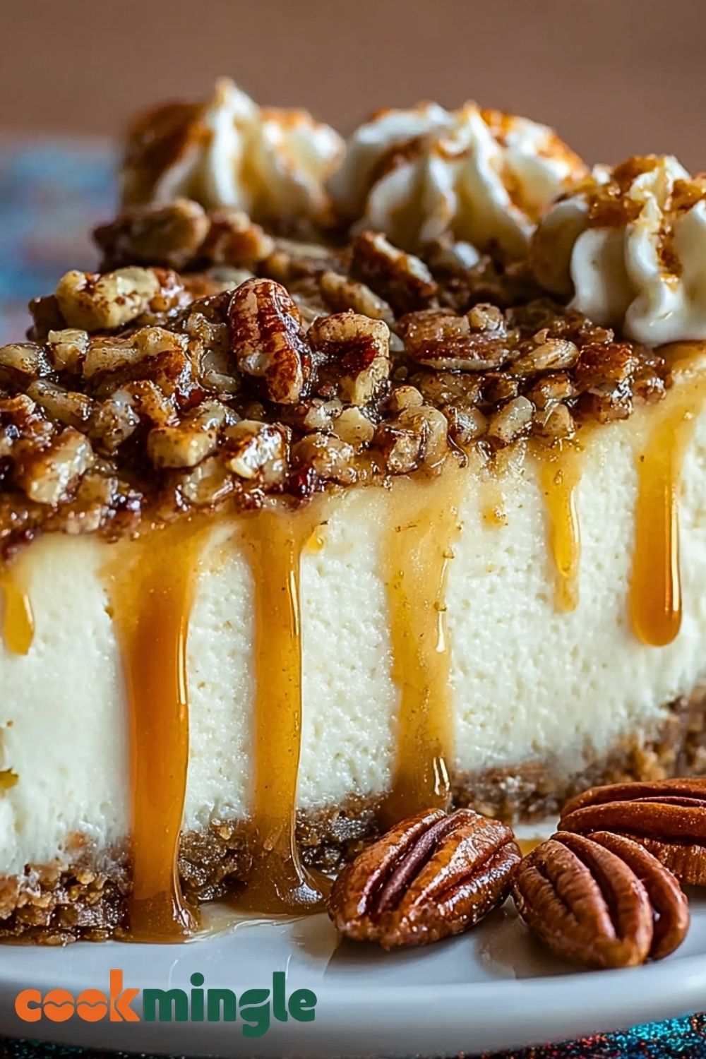Whip the heavy cream with powdered sugar and vanilla extract until soft peaks form. Spread or pipe over the chilled cheesecake and top with remaining toasted pecans for added crunch and presentation.