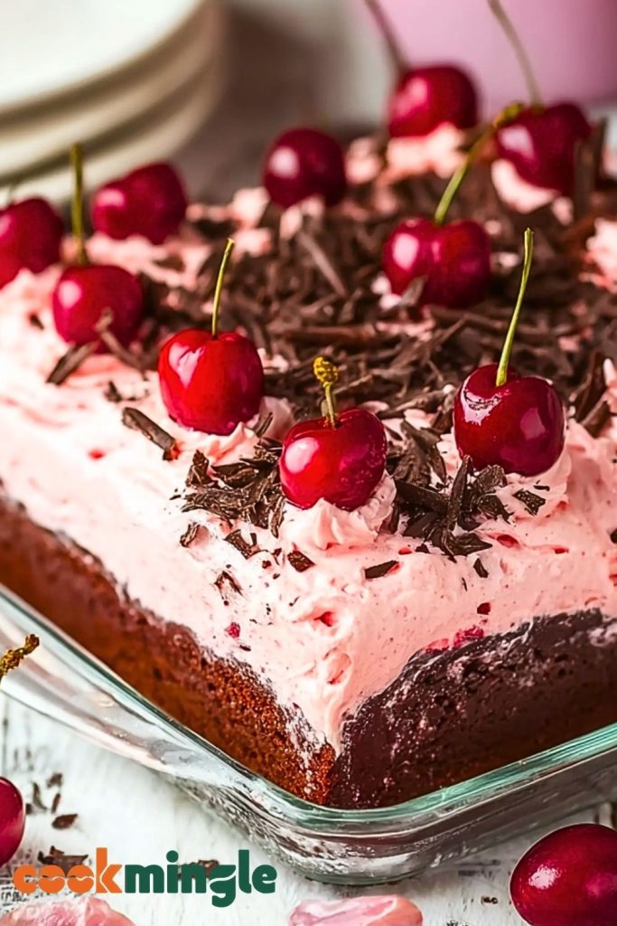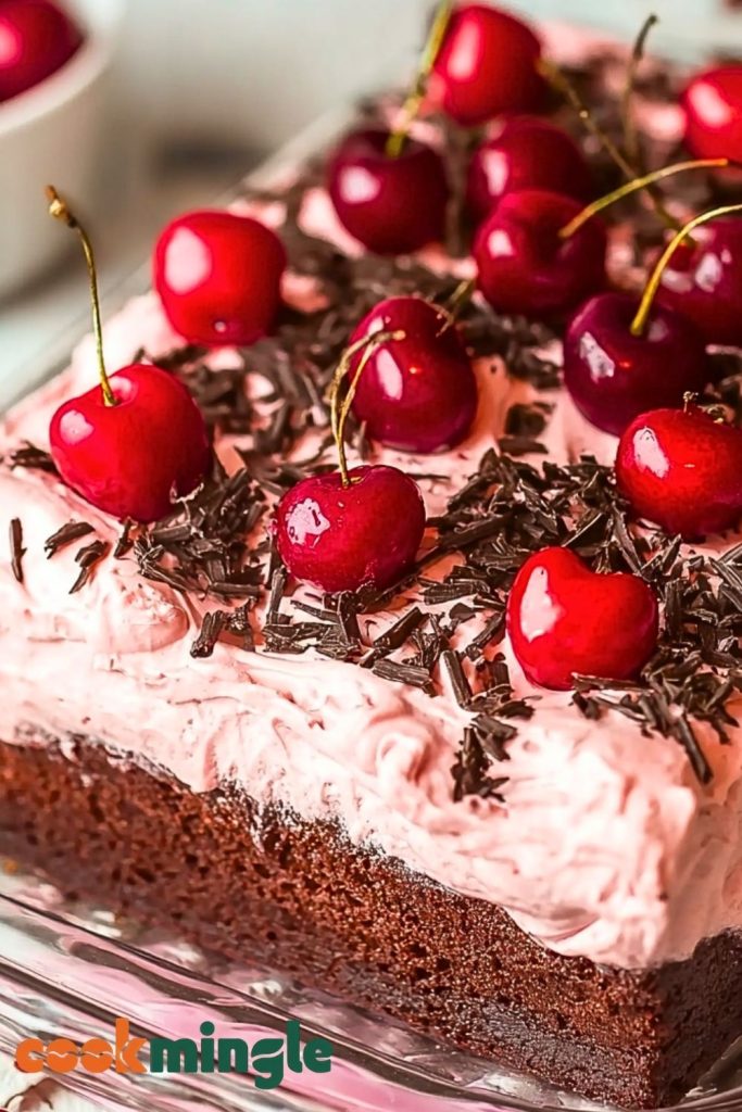 Refrigerate the cake for at least 1–2 hours before serving. This allows the topping to set and the flavors to mingle. Slice into squares and enjoy every fluffy, chocolaty, cherry-filled bite!