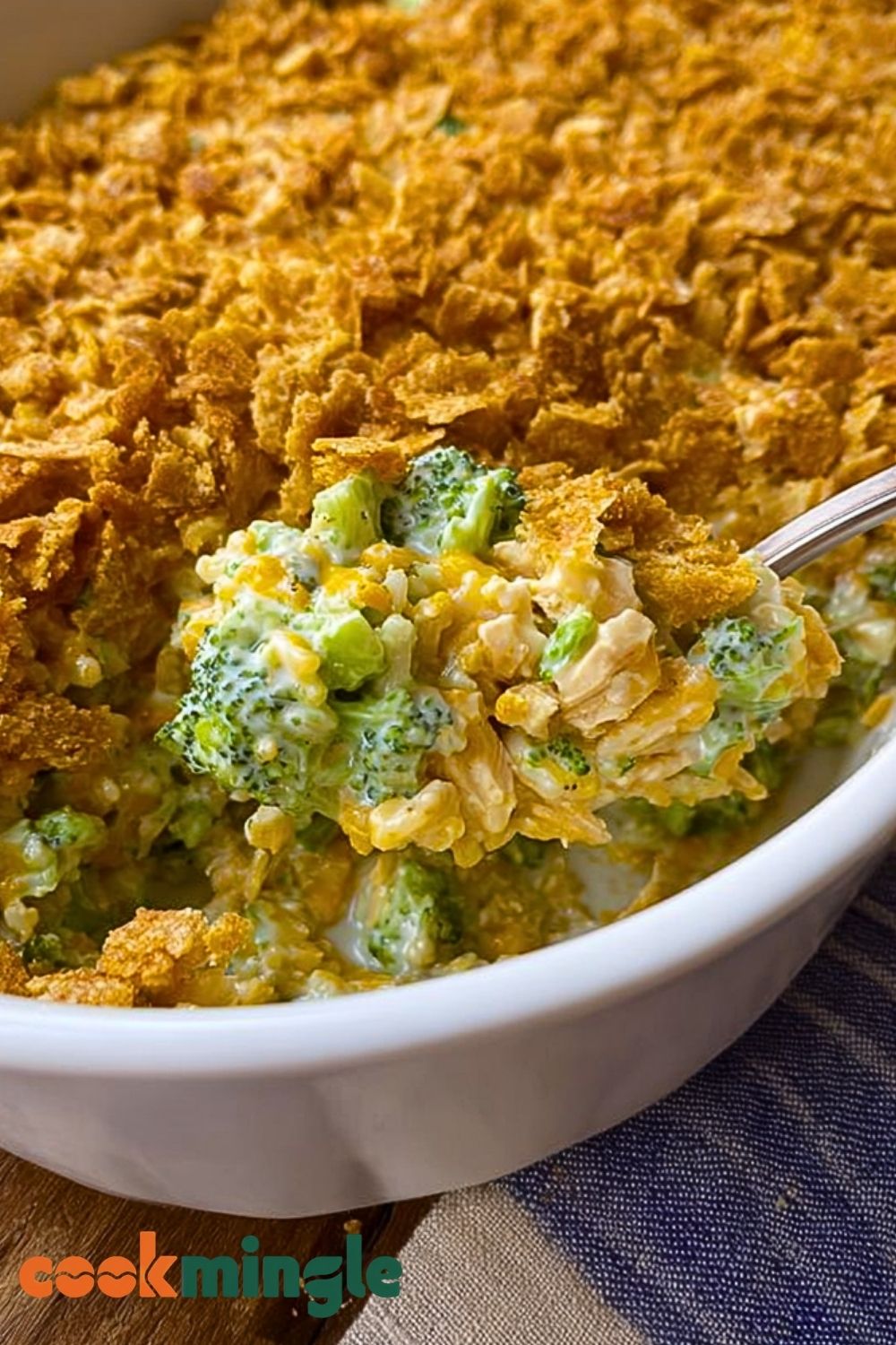 To save time, use rotisserie chicken or leftover cooked chicken. Frozen broccoli can be used but should be thawed and patted dry to prevent sogginess. Make sure the rice is fully cooked and slightly cooled before mixing it with the rest – this keeps the casserole from becoming mushy. Shred your cheese fresh instead of using pre-shredded bags; it melts smoother and adds richer flavor. When applying the topping, don’t crush the cornflakes too fine – you want a light crunch, not crumbs. And finally, let the casserole rest for 5–10 minutes after baking so everything sets nicely before serving.