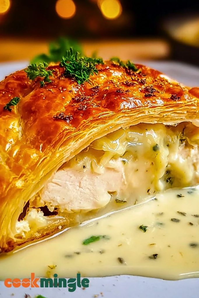 Baking takes approximately 25 to 30 minutes in a preheated oven at 400°F (200°C). The puff pastry should be beautifully golden, and the internal temperature of the chicken should reach 165°F (74°C).