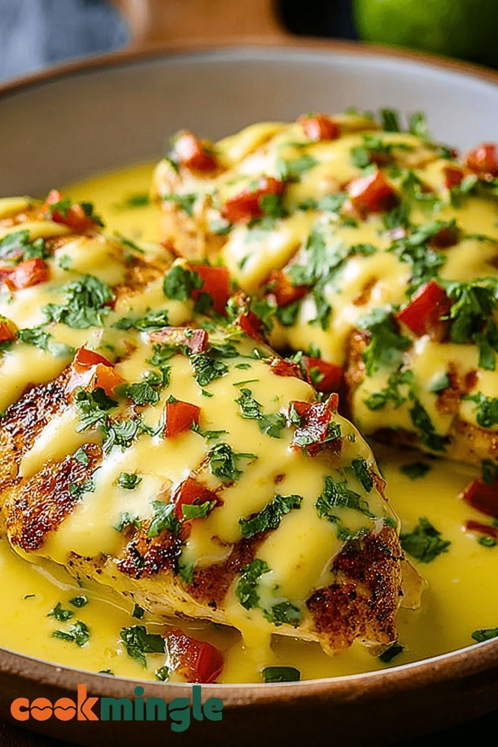 Place the cooked chicken breasts back into the skillet or on a serving dish. Pour the cheese sauce generously over the top. Sprinkle with diced red bell pepper and fresh parsley. Optional: squeeze a little lime juice over the top to brighten the flavors.