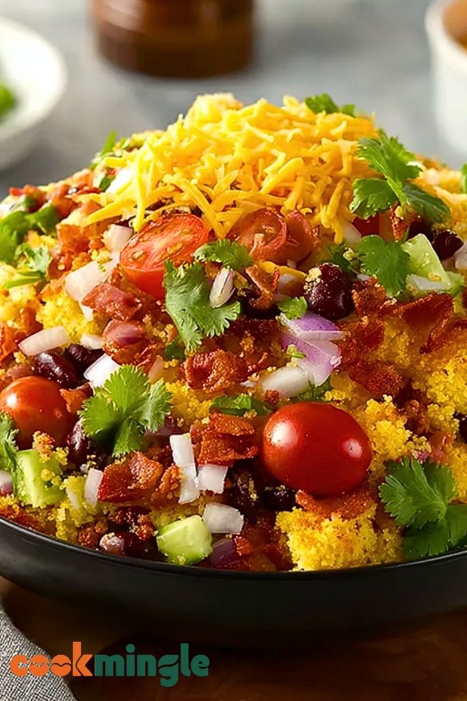 This salad is a showstopper. Not only is it beautiful to look at with its layers of color and texture, but it also bursts with bold flavors in every bite. The combination of crumbly cornbread, seasoned beans, crisp veggies, and rich cheese makes it incredibly satisfying. It’s the kind of dish that surprises people—they don’t expect a salad to taste this indulgent. It also scales beautifully, so whether you’re feeding four or a crowd, it holds up wonderfully.