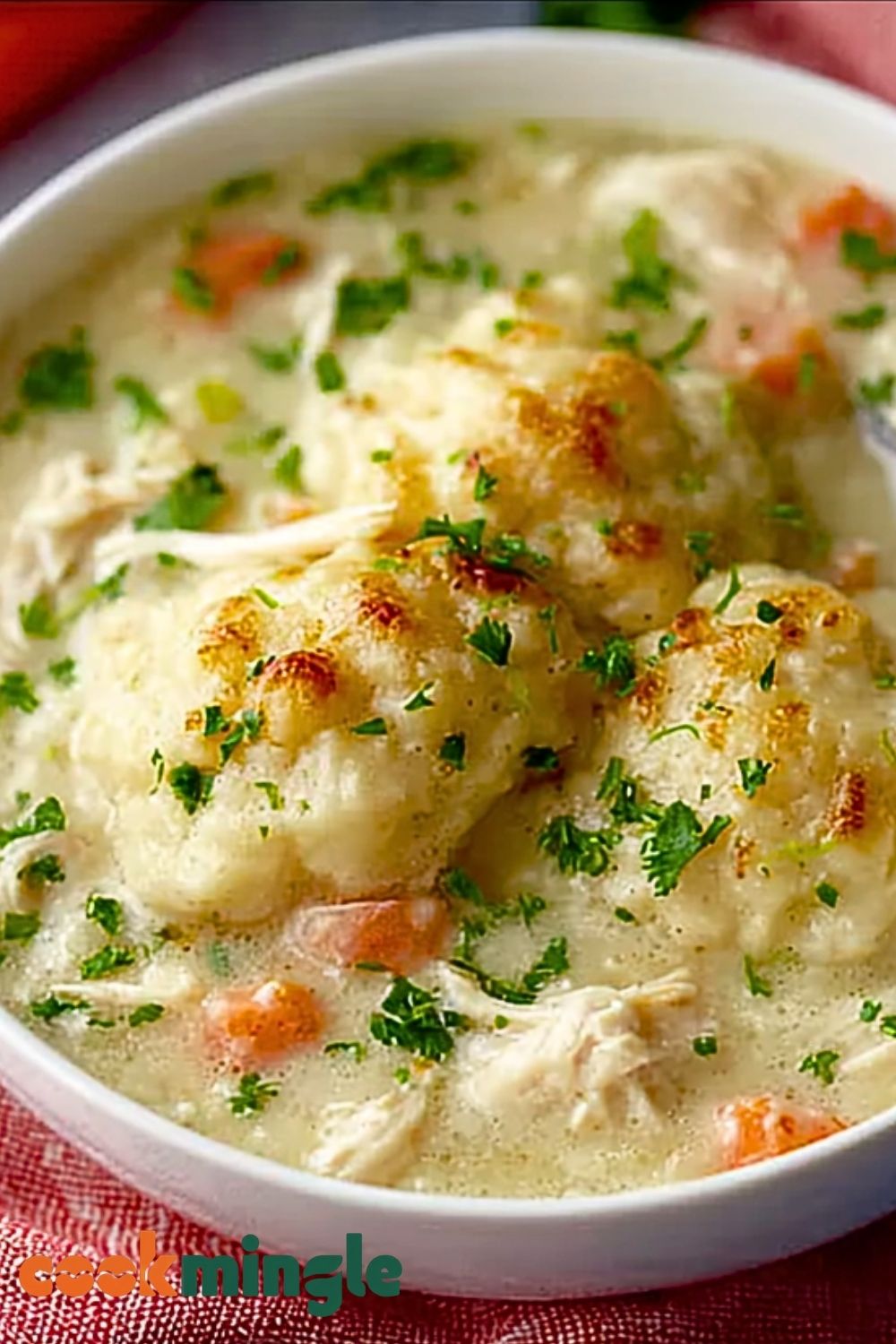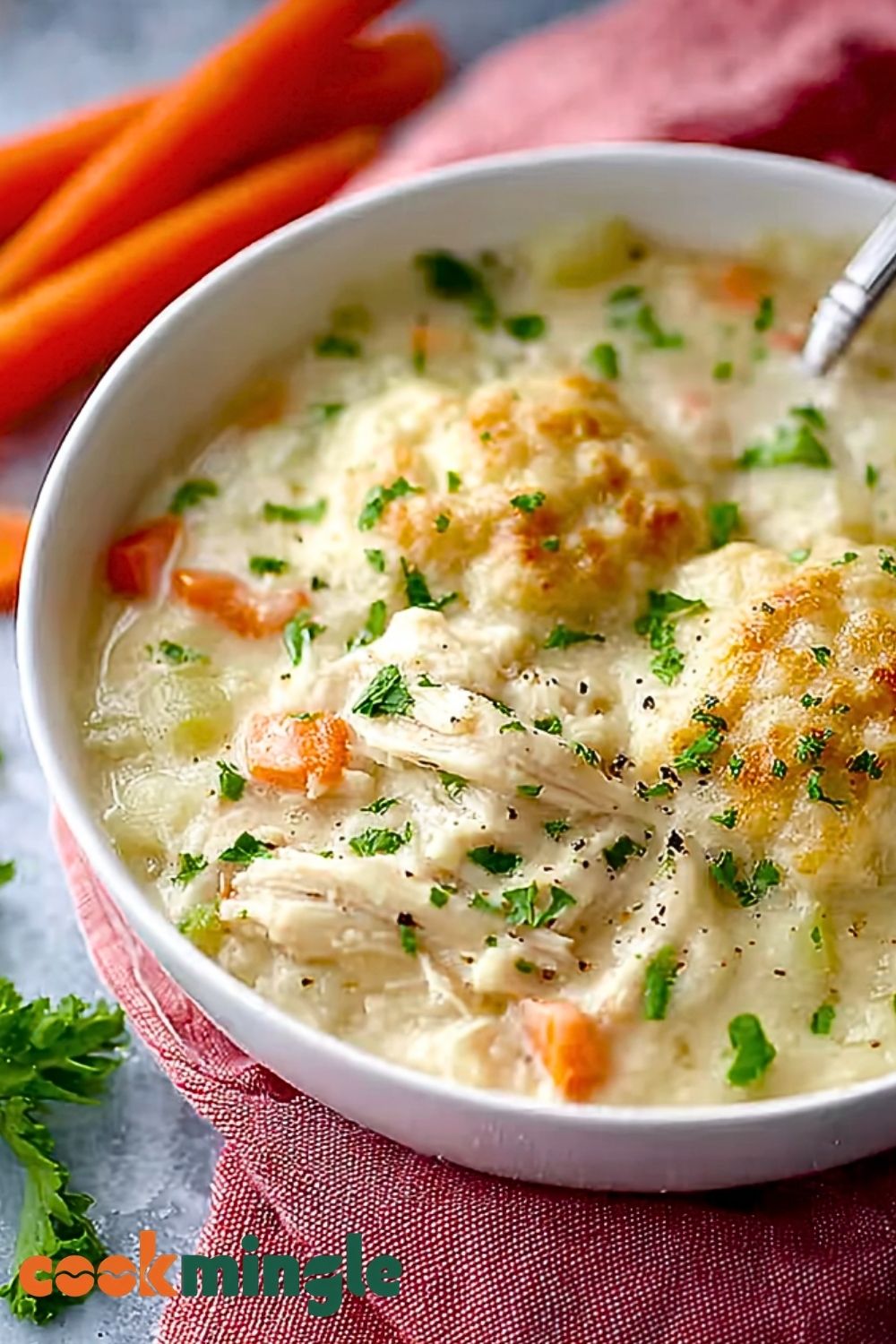 For the best results, use boneless, skinless chicken thighs or breasts, as they cook faster and shred easily. Don’t rush the sautéing of vegetables—letting the onions, carrots, and celery soften and slightly caramelize adds layers of flavor. When making the biscuit dumplings, avoid overmixing the dough; just stir until combined to keep them light and fluffy. Also, be patient when simmering the dumplings—keep the lid on initially to steam them through, then uncover to give them a golden top. Fresh herbs can elevate the flavor, but dried ones work just fine too.