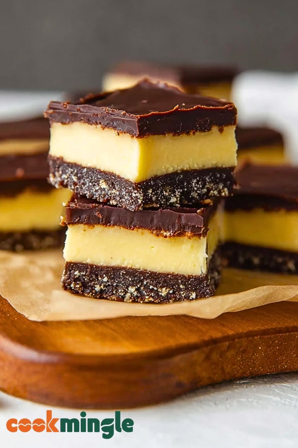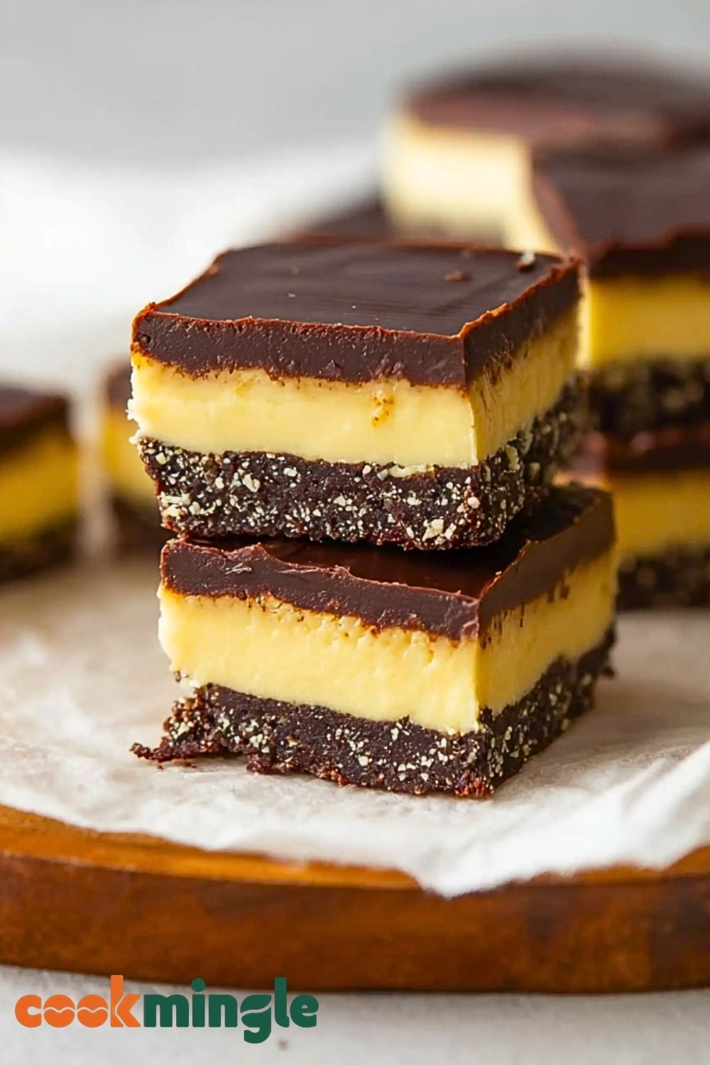 Start by prepping your baking pan with parchment, leaving some overhang so the bars can be lifted out easily. Always melt the chocolate layers gently over low heat or in a double boiler to prevent seizing. For the custard layer, room-temperature butter helps create that velvety smooth consistency. Make sure each layer sets well in the fridge before adding the next to ensure clean, defined layers when sliced. When cutting the final product, use a sharp knife dipped in hot water and wiped dry between slices for crisp edges.