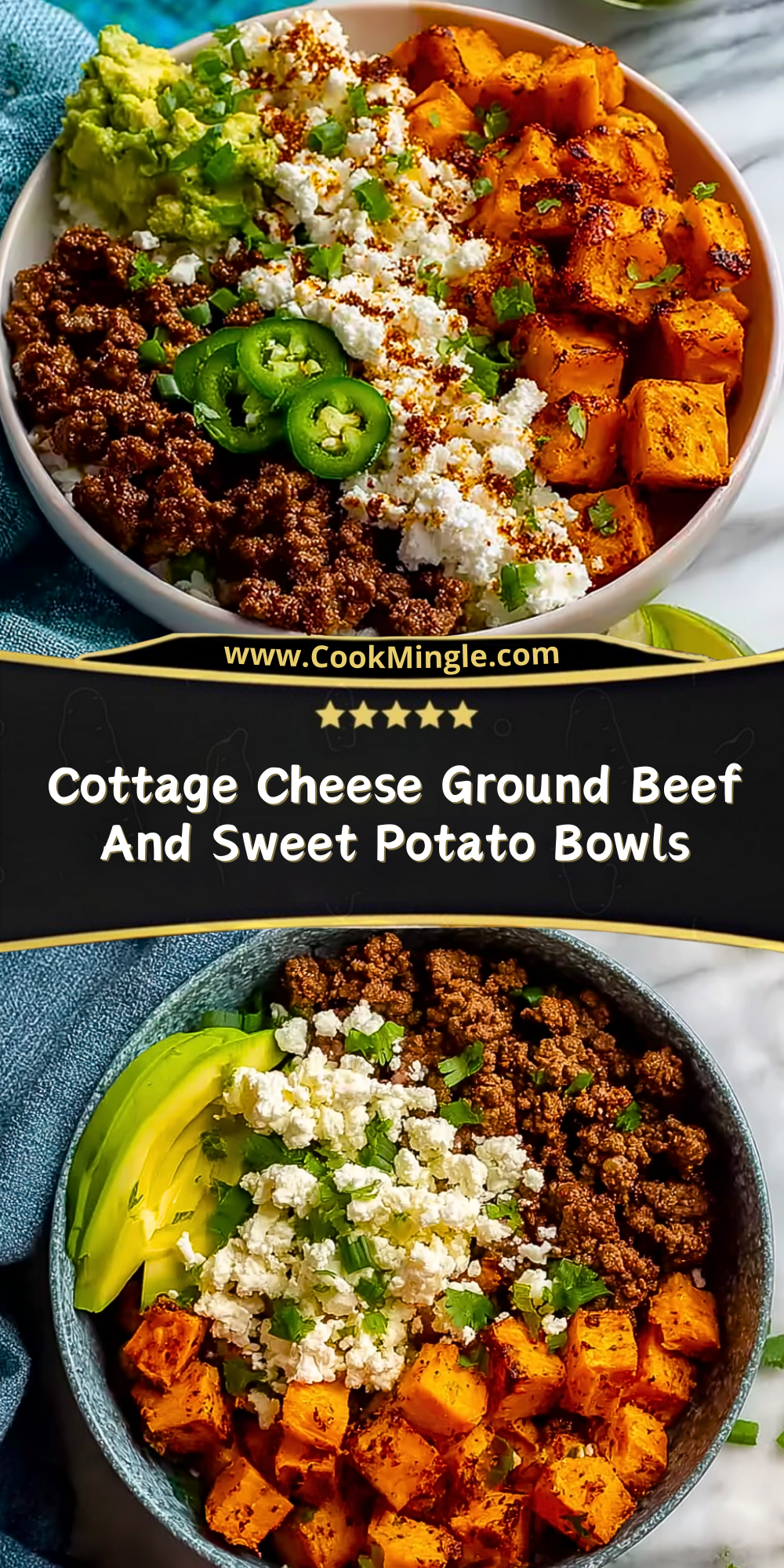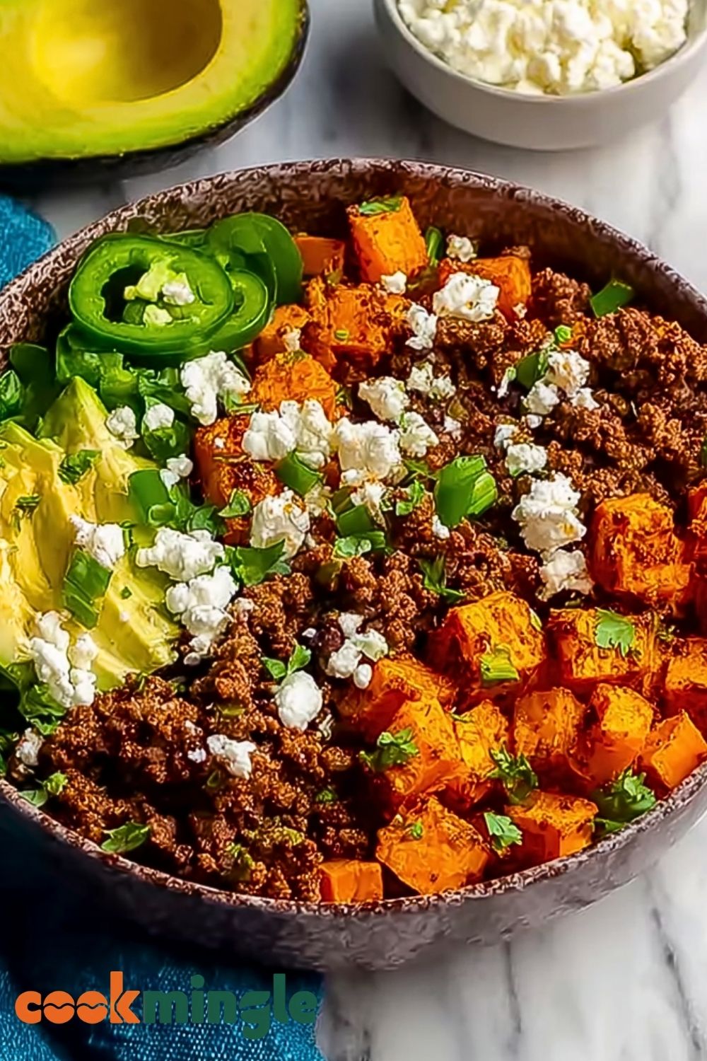 Divide the roasted sweet potatoes into serving bowls. Add a generous scoop of ground beef, a spoonful of cottage cheese, a few avocado slices, and jalapeño rounds. Sprinkle green onions or chives on top. Add optional garnishes like lime juice, hot sauce, or chopped cilantro for extra flair.