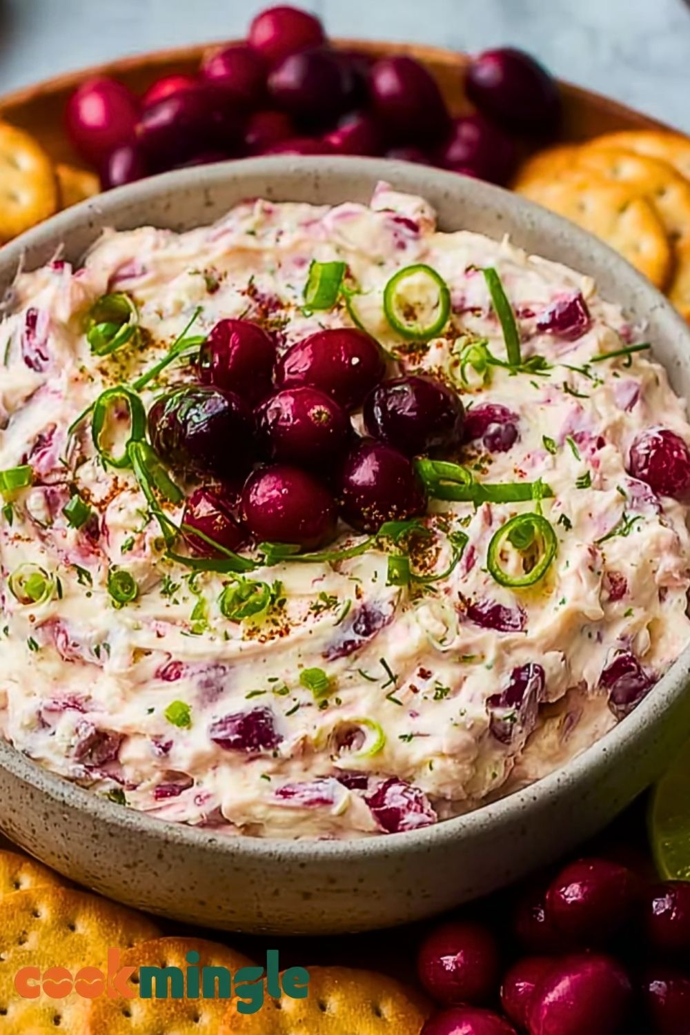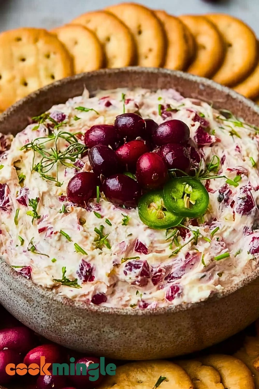 7. Garnish with fresh cranberries, jalapeño slices, or herbs. Serve with crackers or veggies.