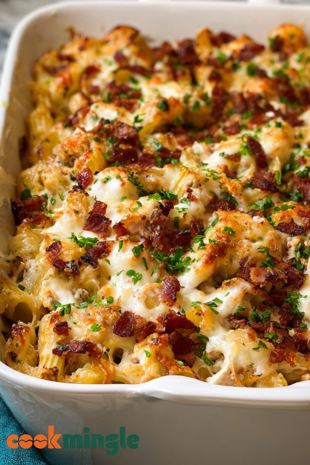 Cook your pasta just until al dente—overcooked pasta can become mushy when baked. When mixing ingredients, fold gently to avoid breaking the pasta or shredding the chicken too much. If you’re prepping this ahead of time, store it covered in the fridge and add an extra 5–10 minutes to the baking time. Using freshly cooked and crumbled bacon instead of bacon bits elevates the flavor significantly. For best results, let the casserole rest for 5 minutes after baking before serving, allowing everything to set and making it easier to scoop.