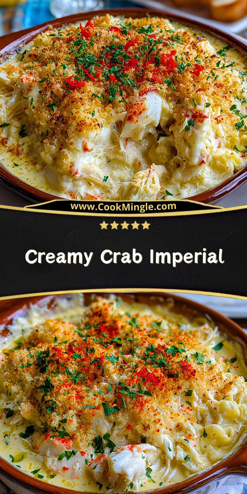 Creamy Crab Imperial is a celebration of simplicity and indulgence. When using high-quality lump crab, less is more — the ingredients should enhance, not overpower, the natural sweetness of the seafood. If you’re hosting, the dish can be prepared several hours in advance and baked just before serving. For a low-carb option, you can skip the breadcrumb topping or replace it with crushed pork rinds or almond flour crumbs. The dish also works beautifully in individual ramekins for elegant single servings.