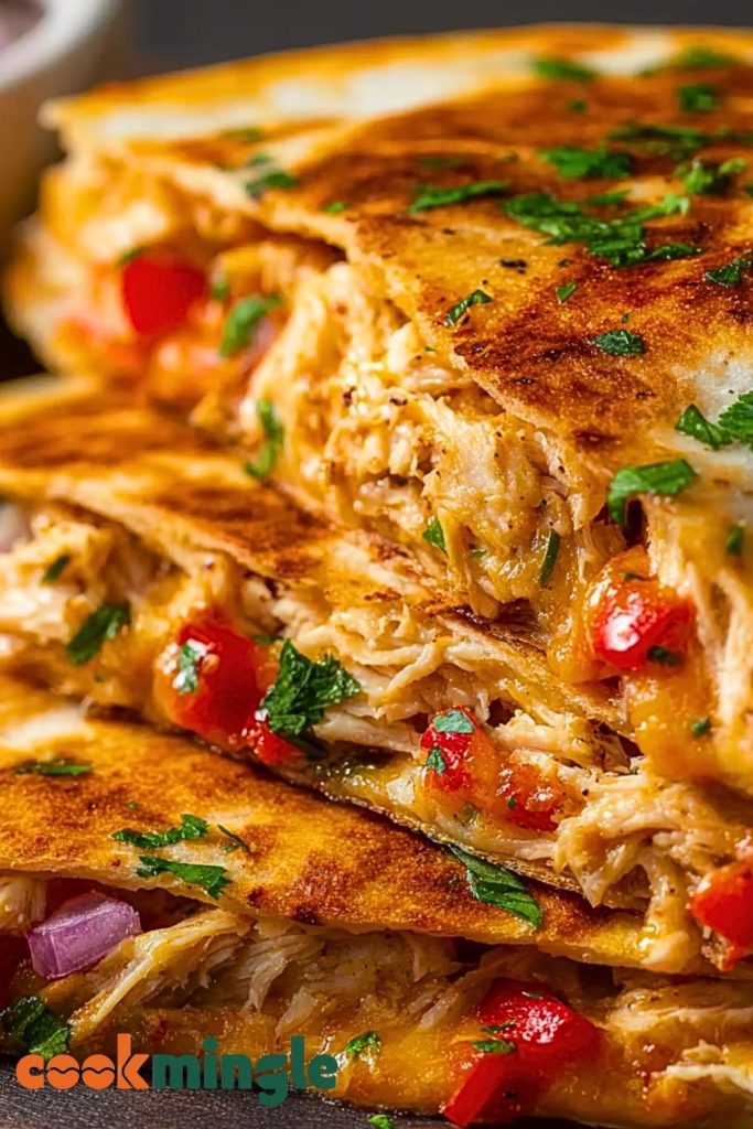 Golden, cheesy, and packed with flavor—Crispy Chicken Quesadillas are the ultimate comfort food with a Tex-Mex twist. Imagine biting into a perfectly toasted tortilla, its edges crackling under your teeth, only to reveal a melty blend of shredded chicken, gooey cheddar cheese, sweet red peppers, and the sharp tang of red onions. Every bite delivers bold spices and textures that keep you coming back for more.