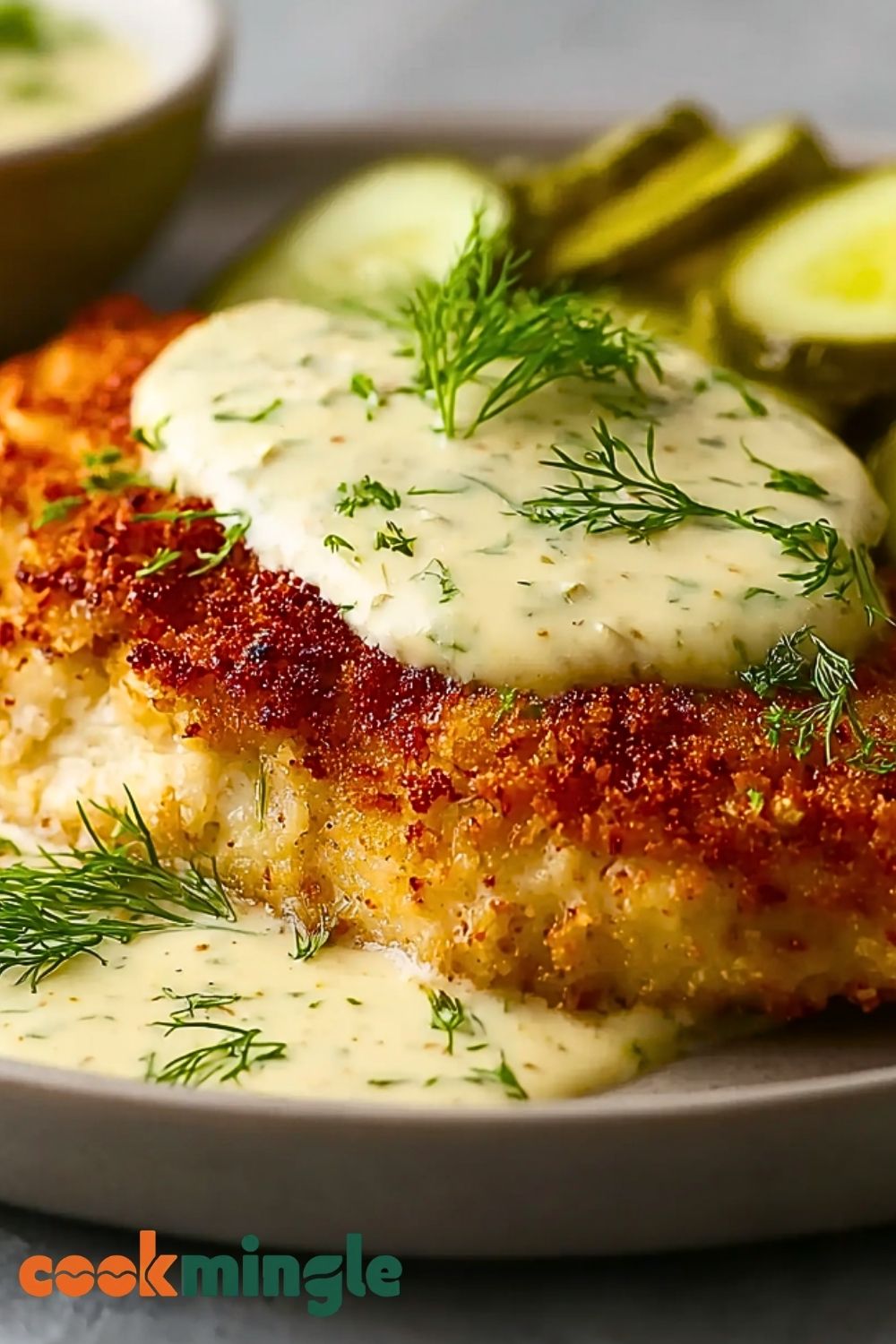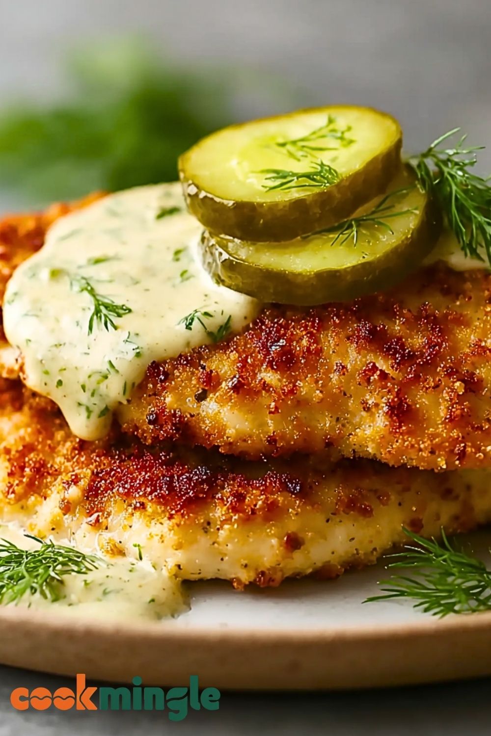 Place the crispy chicken on a serving plate, spoon over a generous amount of the dill sauce, and top with pickle slices. Finish with a sprinkle of fresh dill for that final aromatic touch.