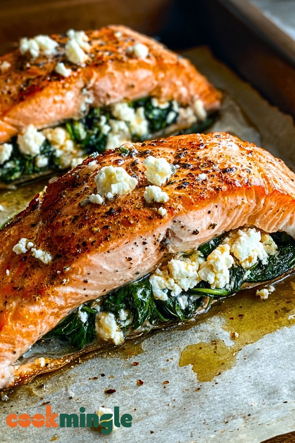 For the best results, choose fresh, high-quality salmon fillets with even thickness to ensure consistent cooking. Pat the salmon dry before seasoning so it develops a nice outer texture when baked. When preparing the filling, avoid overcooking the spinach—just a quick sauté is enough to wilt it while preserving its vibrant color and nutrients. Be mindful not to overstuff the salmon, as this can cause the filling to spill out during cooking. A light drizzle of olive oil and proper seasoning before baking enhances both flavor and moisture, ensuring a perfectly tender and juicy result.