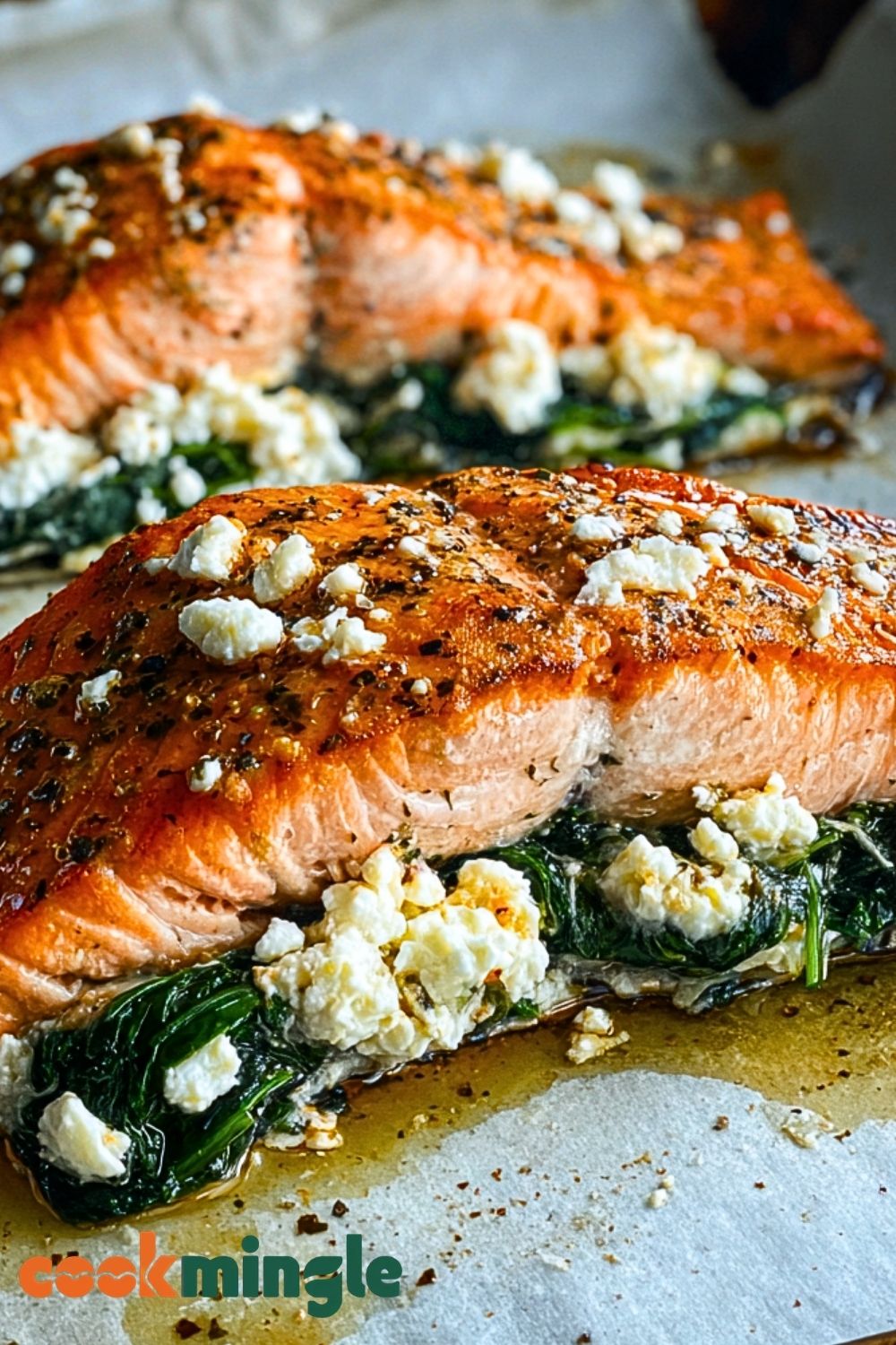Store any leftover spinach and feta stuffed salmon in an airtight container in the refrigerator for up to 3 days. To reheat, place the salmon in a low-temperature oven (around 300°F / 150°C) until warmed through to avoid drying it out. You can also microwave it in short intervals, though this may slightly affect the texture. If you plan to freeze it, wrap each portion tightly in plastic wrap and place in a freezer-safe container for up to 2 months. Thaw overnight in the refrigerator before reheating.