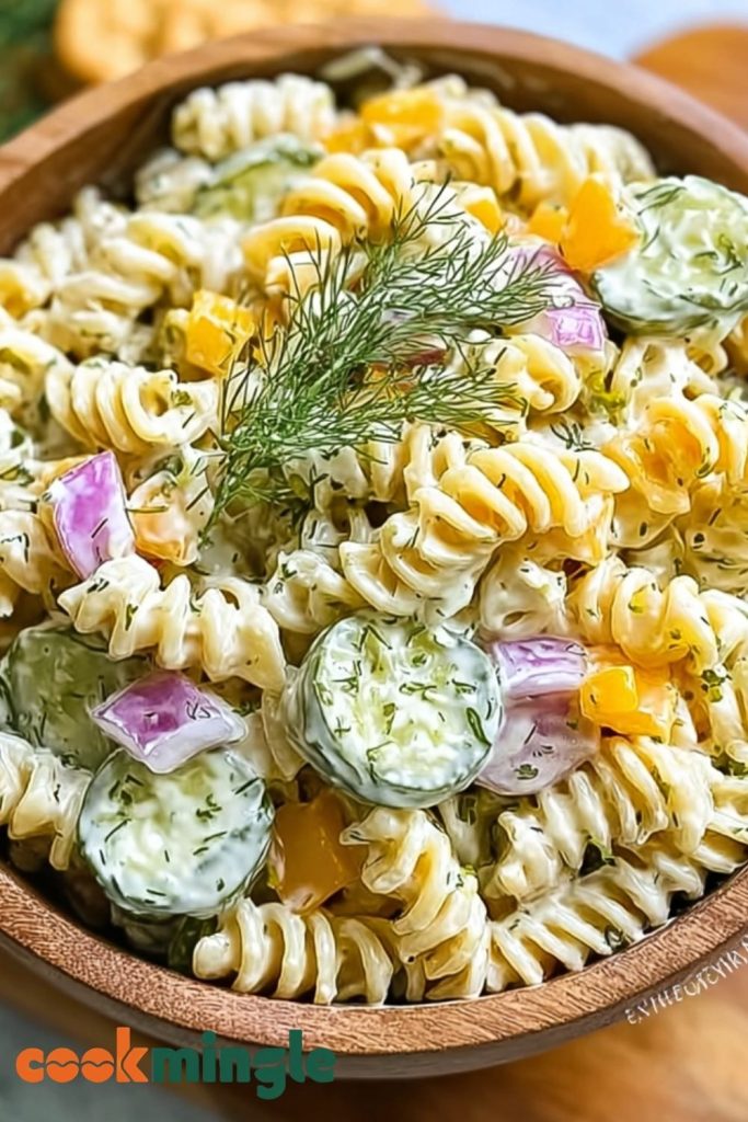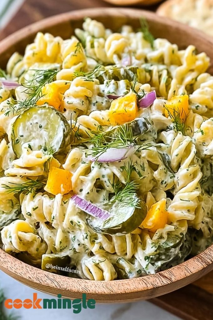 4. In a large bowl, combine cooked pasta, pickles, cheese, red onion, and dill. Pour the dressing over and toss until well coated.