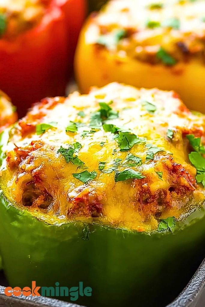 You can use any color bell pepper you like — green, red, yellow, or orange all work. Green peppers are slightly more bitter, while red, yellow, and orange are sweeter. I like using a mix for color contrast and flavor variety. Just make sure the peppers are firm and have flat bottoms so they stand upright in the baking dish.