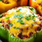 Preheat your oven to 375°F (190°C). Cover the baking dish with foil and bake the stuffed peppers for 30 minutes. Then remove the foil, sprinkle shredded cheese on top of each pepper, and return to the oven uncovered for another 10–15 minutes, or until the cheese is bubbly and golden.