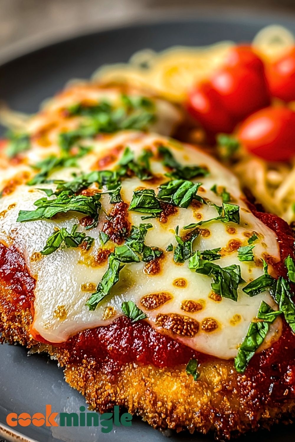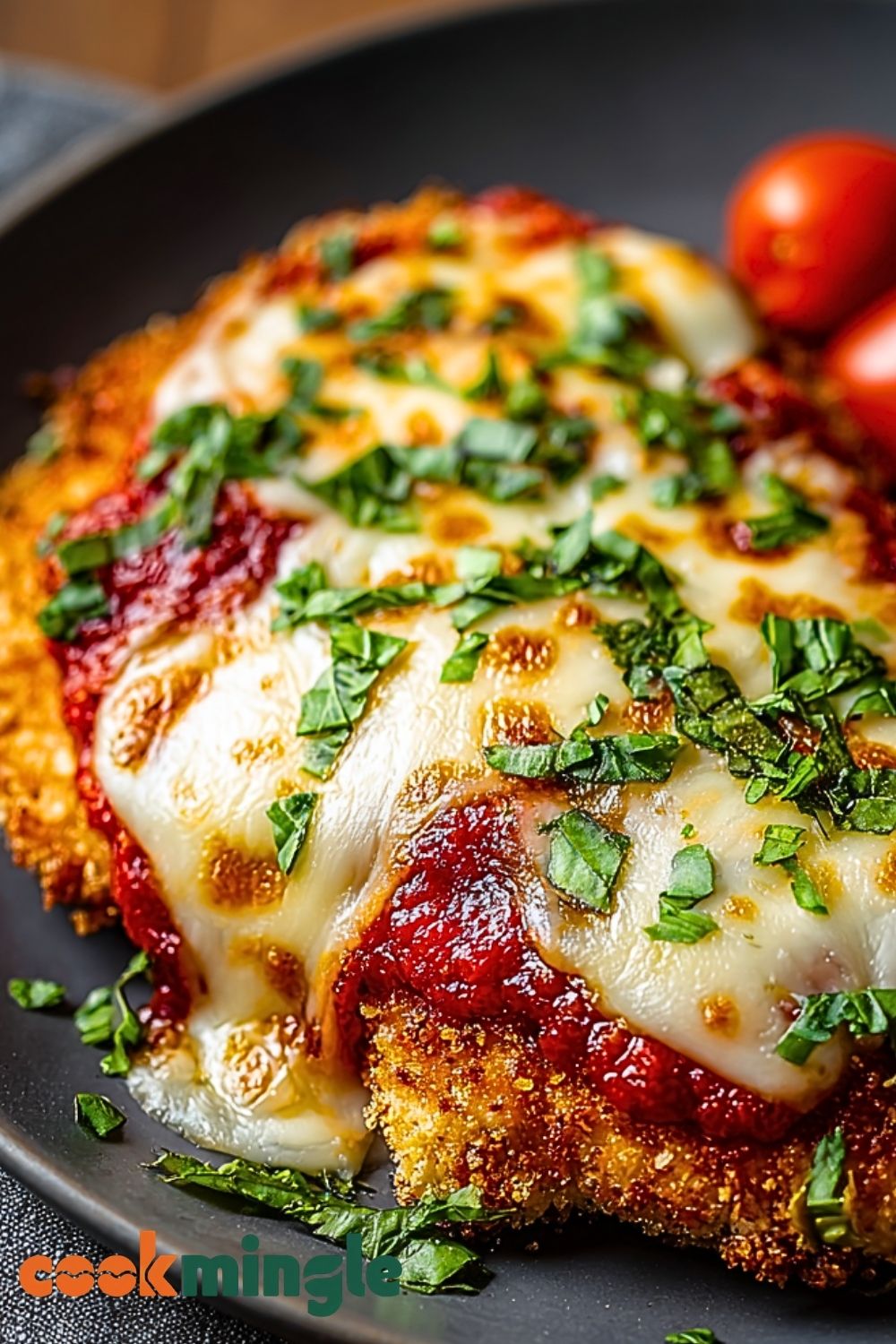 Preheat your oven to 425°F (220°C). Place the fried cutlets in a baking dish. Spoon marinara sauce over each piece, then top generously with mozzarella. Bake for about 10–12 minutes, or until the cheese is bubbly and slightly browned.