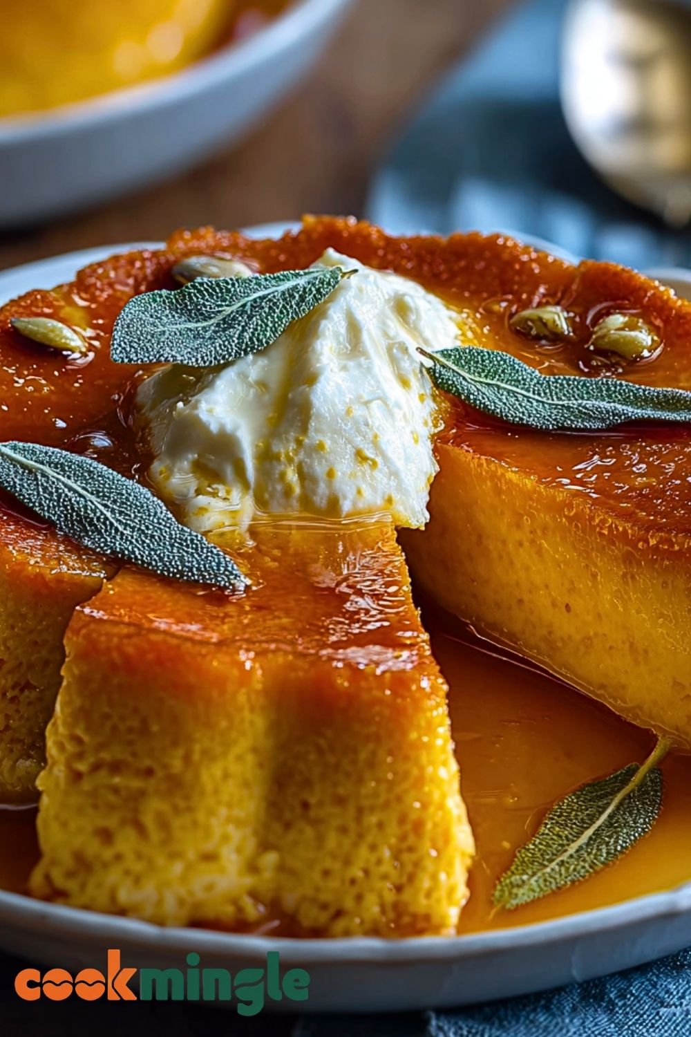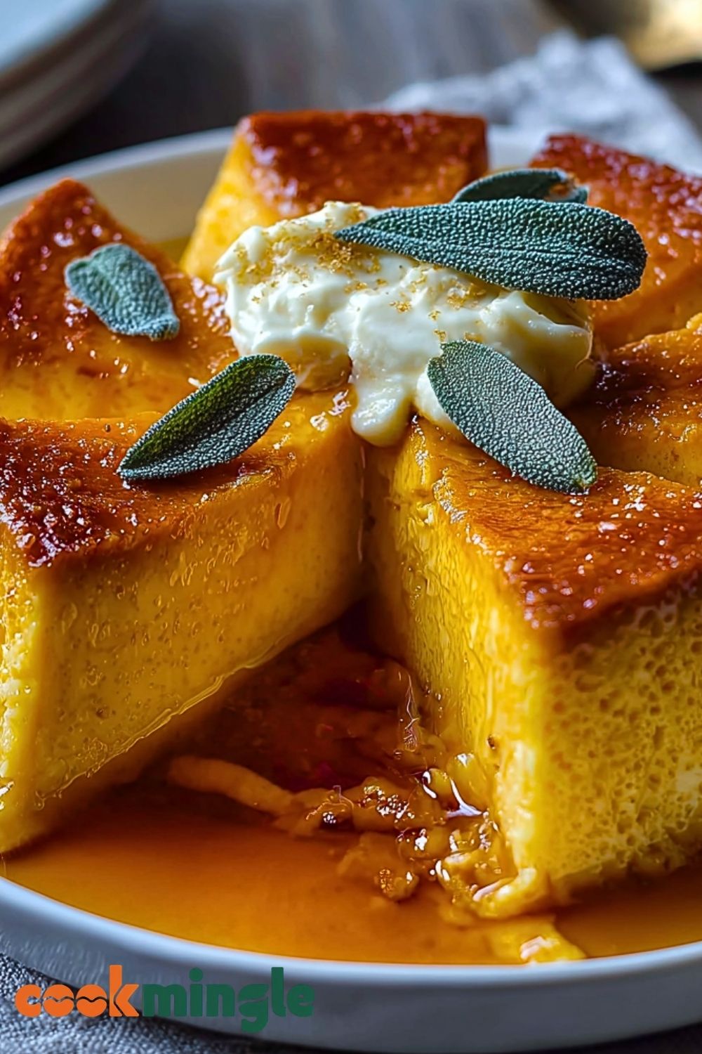 Run a knife around the edges of the flan to loosen it. Place a large plate on top of the dish and quickly invert it. The caramel will flow over the flan, creating a glossy, delicious sauce. Garnish with a few sage leaves or whipped cream if desired, then serve chilled.