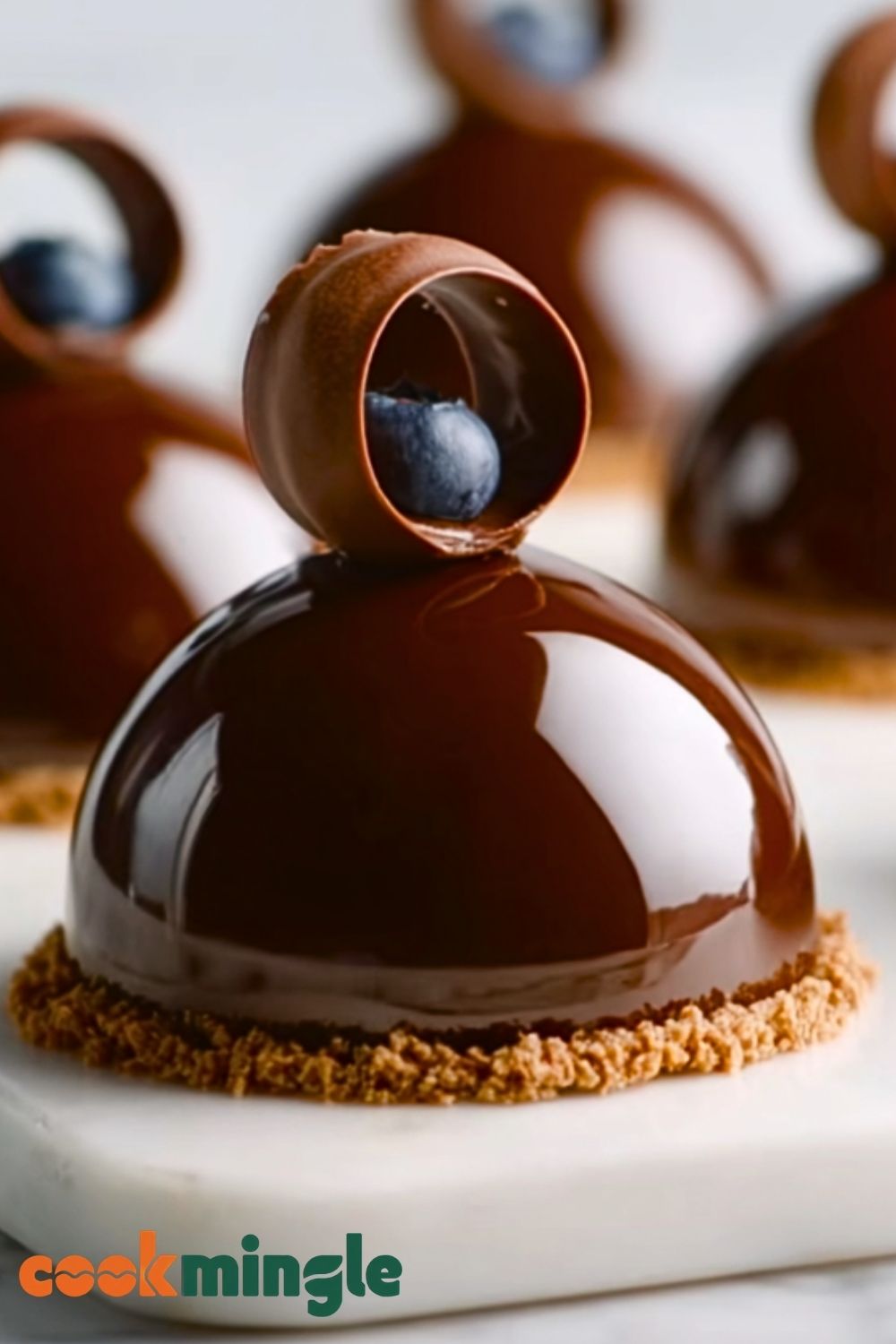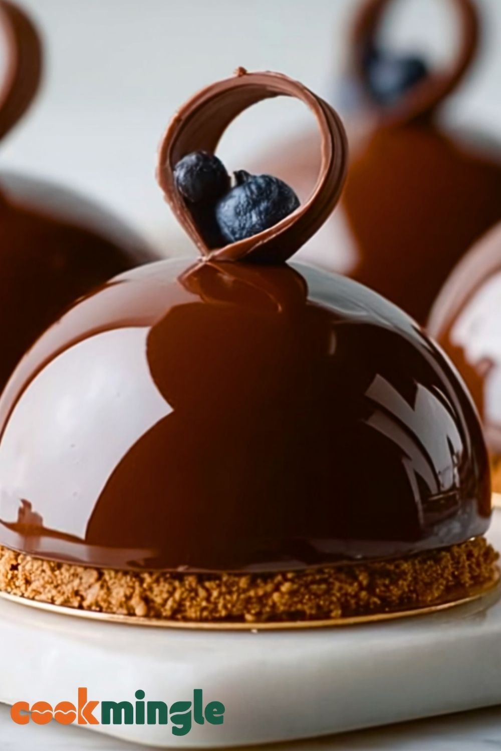 Once glazed and set, top each dome with a chocolate curl or edible decoration. Refrigerate until ready to serve — ideally for at least an hour to allow the glaze to set completely. Serve chilled and enjoy the stunning layers and textures of this elegant dessert.