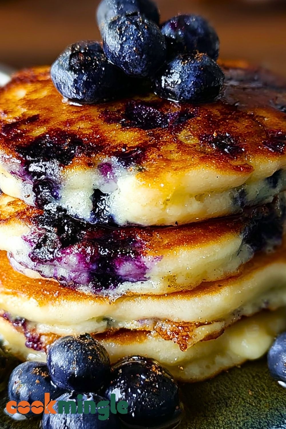 Stack the pancakes high, top with extra blueberries, a drizzle of maple syrup, and a pat of butter if desired. Enjoy them warm for the best texture and flavor.