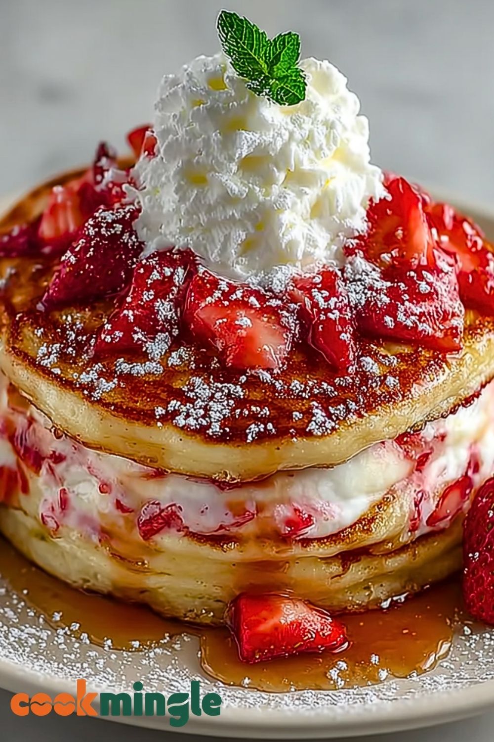 To ensure your pancakes turn out fluffy and light, avoid overmixing the batter—a few lumps are totally fine. Let the batter rest for about 5-10 minutes after mixing to allow the baking powder to activate. When cooking, wait until you see bubbles forming on the surface before flipping. For the cheesecake layer, bring cream cheese to room temperature before mixing to avoid lumps. Lastly, use fresh, ripe strawberries for the best flavor and color. If making ahead, keep components separate and assemble just before serving to maintain texture.