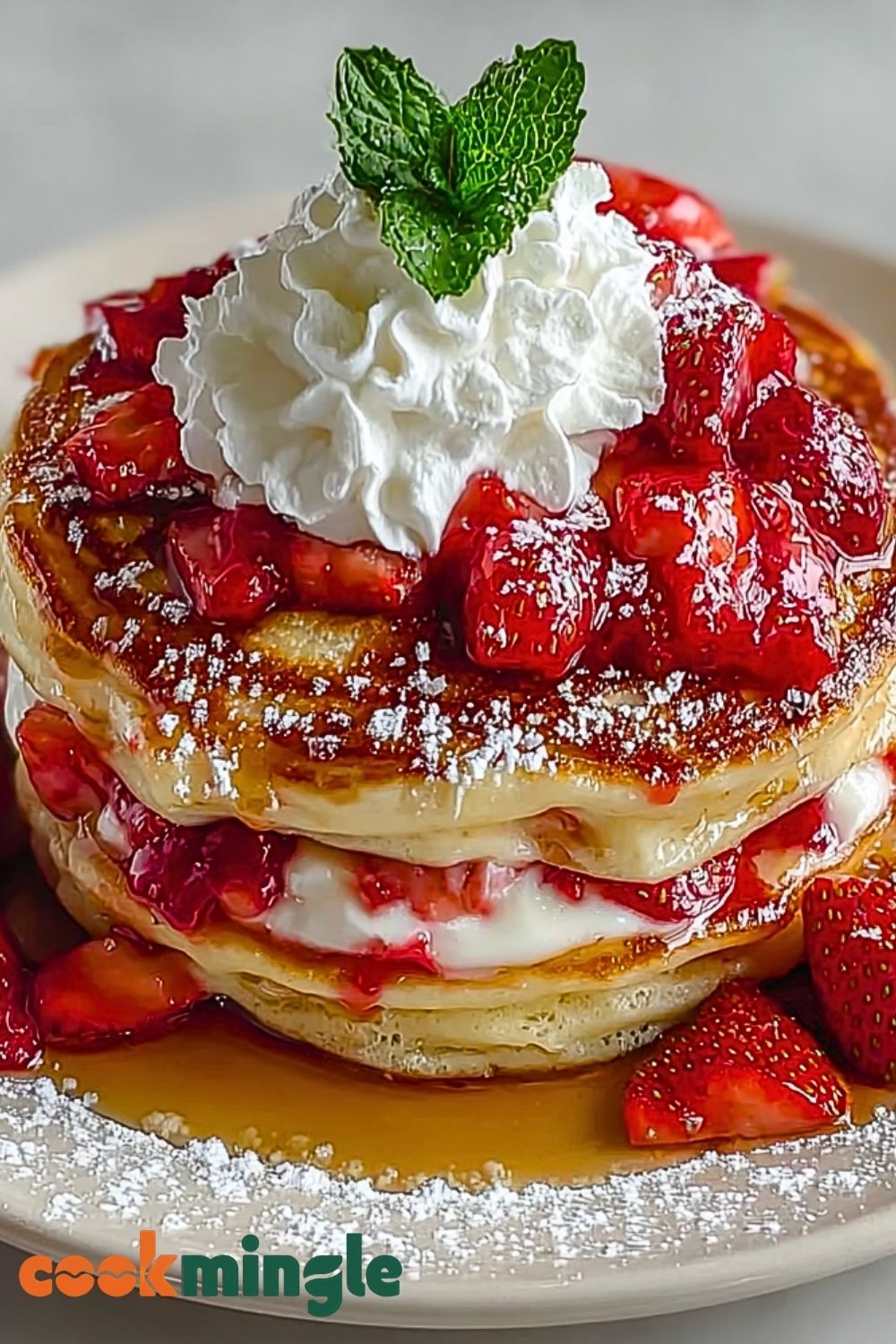 Place one pancake on a serving plate, spread a layer of cheesecake filling, spoon over some strawberry topping, and repeat with 2-3 more layers. Finish the top layer with whipped cream, extra strawberries, a drizzle of syrup, and a dusting of powdered sugar.