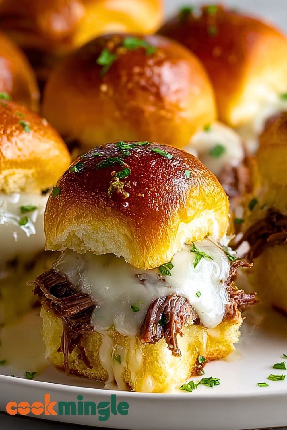 Soft, slightly sweet rolls like Hawaiian rolls are ideal for this recipe. Their fluffy texture holds up well to the juicy beef and melty cheese, and they toast beautifully under a layer of melted butter and herbs. If you can’t find Hawaiian rolls, try any soft dinner roll or slider bun that’s sturdy but not too dense.