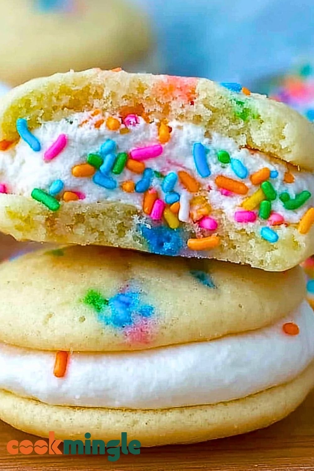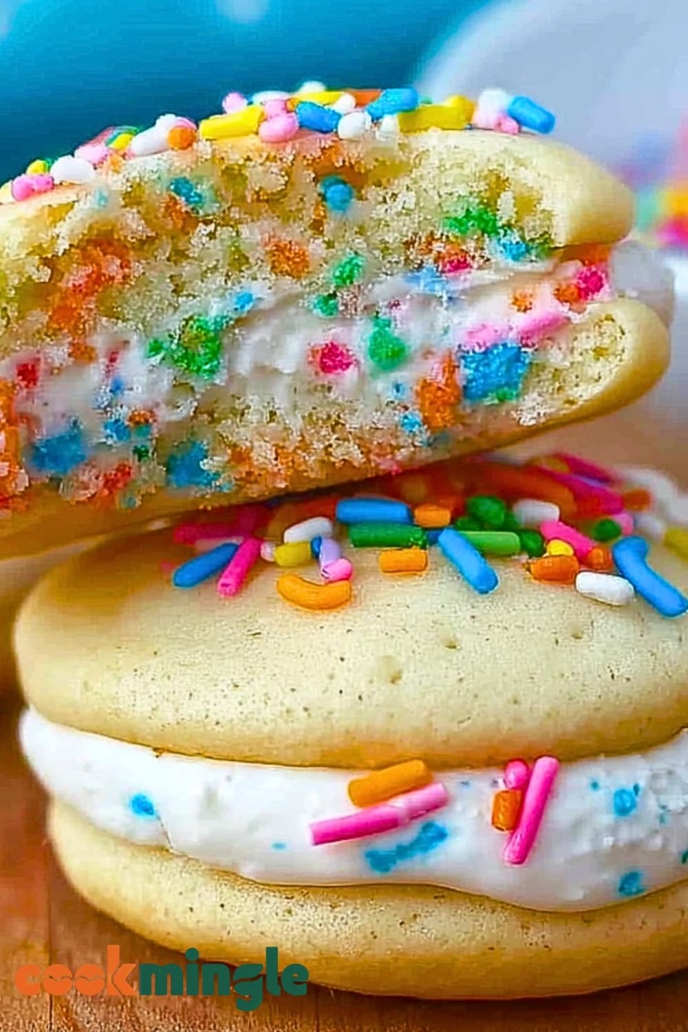 Store assembled Funfetti Whoopie Pies in an airtight container in the refrigerator for up to 4 days. Let them sit at room temperature for 10–15 minutes before serving to soften the filling. If storing unassembled, keep the cookies and filling separate — cookies at room temp and filling in the fridge. They also freeze well: freeze individually wrapped pies for up to 2 months and thaw overnight in the fridge before enjoying.