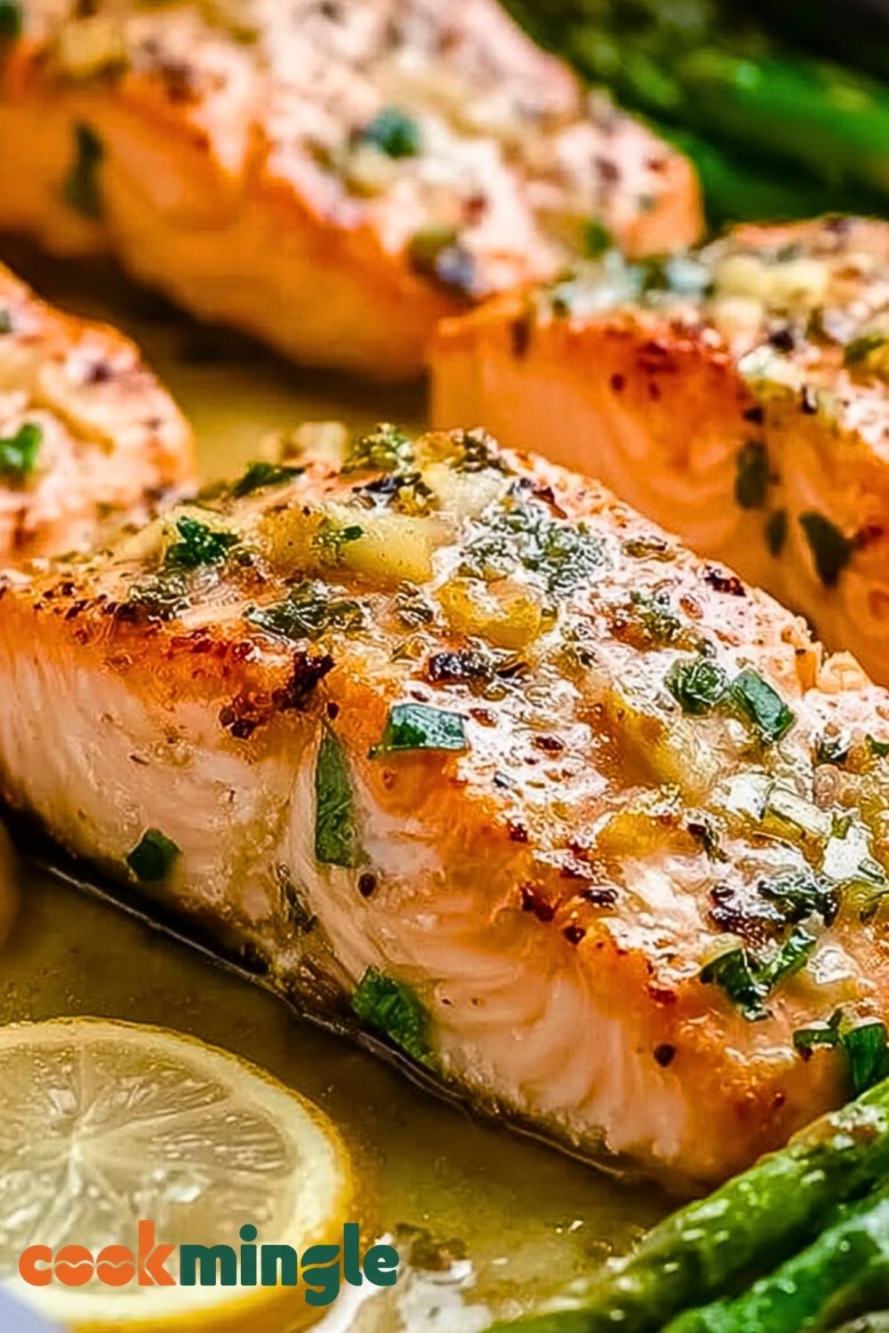 6. Pour the garlic butter sauce evenly over the salmon fillets.