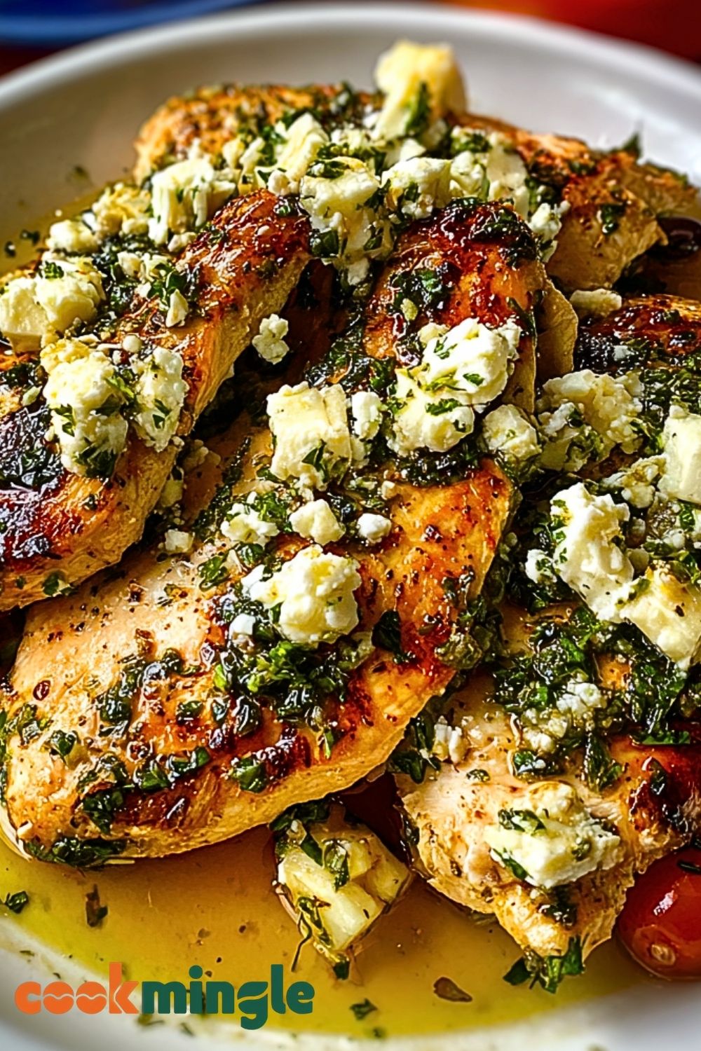 4. Transfer cooked chicken to a plate. While hot, top with crumbled feta and fresh parsley.