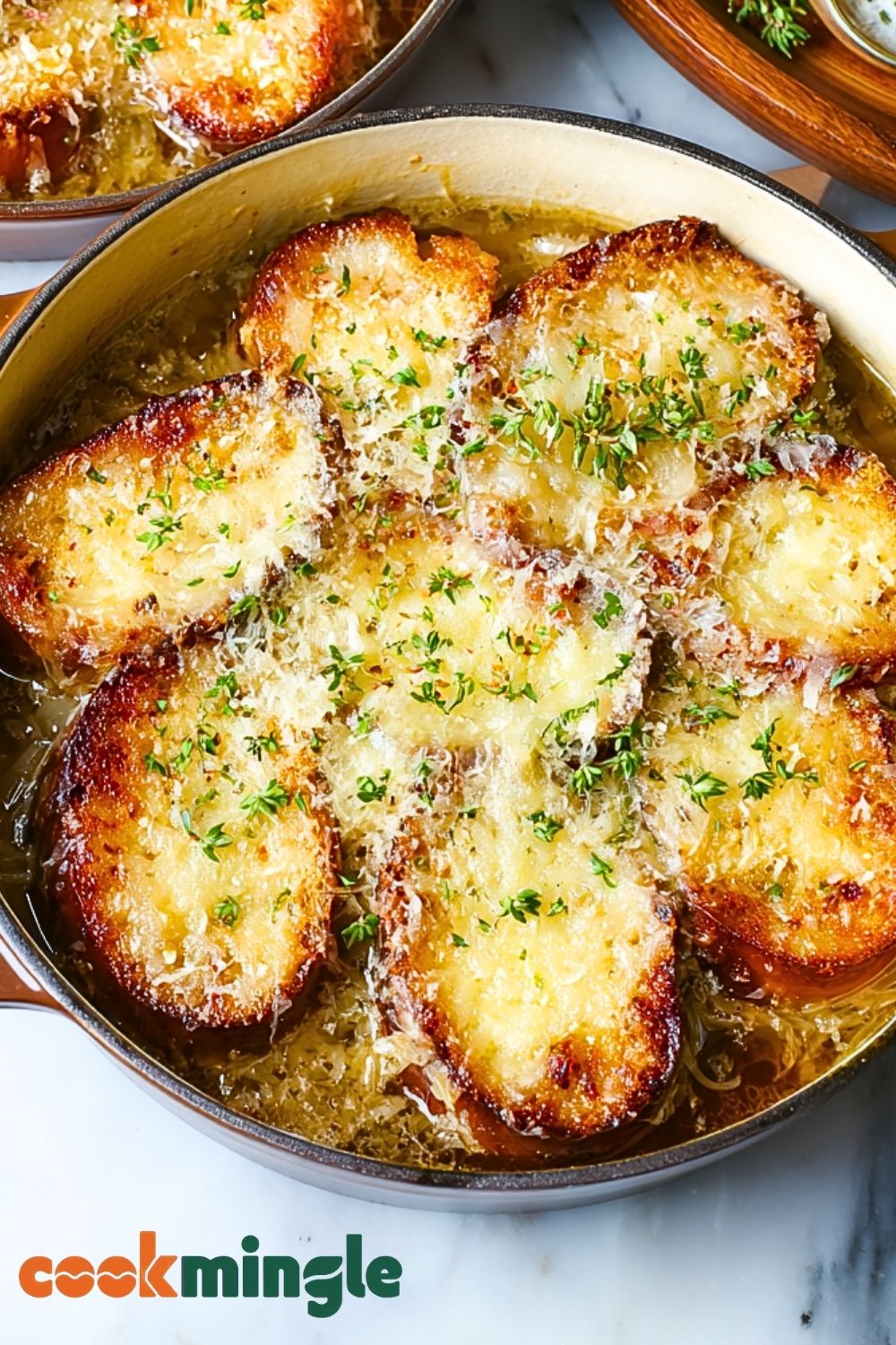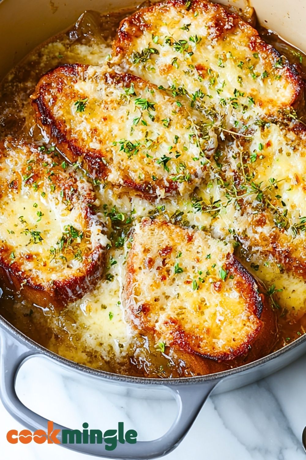 Carefully remove from the oven and let cool for a minute. Garnish with fresh thyme or parsley if desired. Serve hot and enjoy the melty, savory goodness.