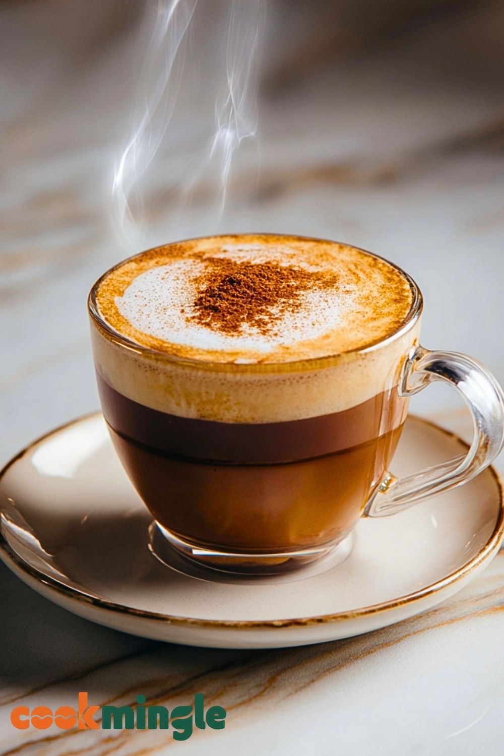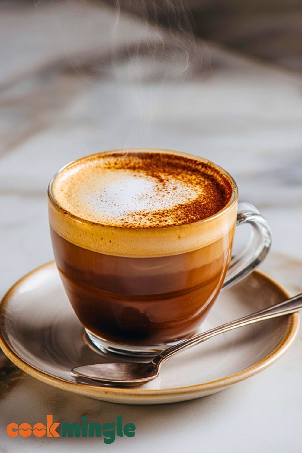 Pour the hot steamed milk into your cup. Then strain the shaken espresso over the milk, letting the foam settle beautifully on top. Optionally, sprinkle a little extra cinnamon over the foam for a cozy finishing touch.