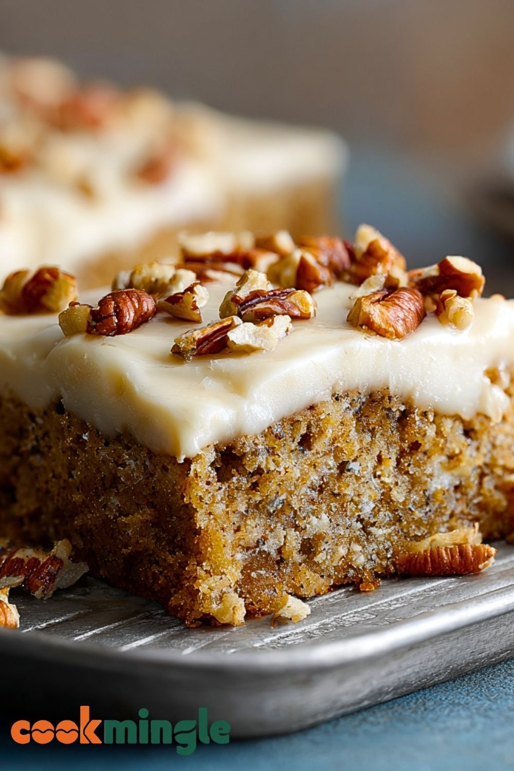 Spread the cream cheese frosting over the completely cooled cake. Sprinkle extra chopped pecans on top for texture and presentation. Slice and serve!