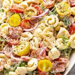 4. In a large bowl, combine cooled pasta, meats, cheeses, and veggies. Pour in half the dressing and mix. Add more as needed.