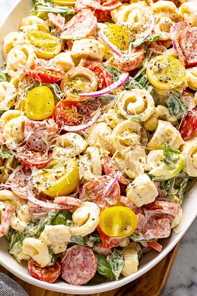 Cook the pasta just until al dente and rinse it under cold water to stop the cooking process—this keeps it firm and prevents the salad from becoming mushy. Chill the pasta slightly before mixing to maintain texture. When slicing meats and cheese, aim for bite-sized pieces to create a balanced forkful every time. Don’t overdress the salad initially—start with half the dressing and add more as needed to coat evenly without overwhelming the ingredients. And finally, let the salad sit in the fridge for 30 minutes before serving to let the flavors meld beautifully.