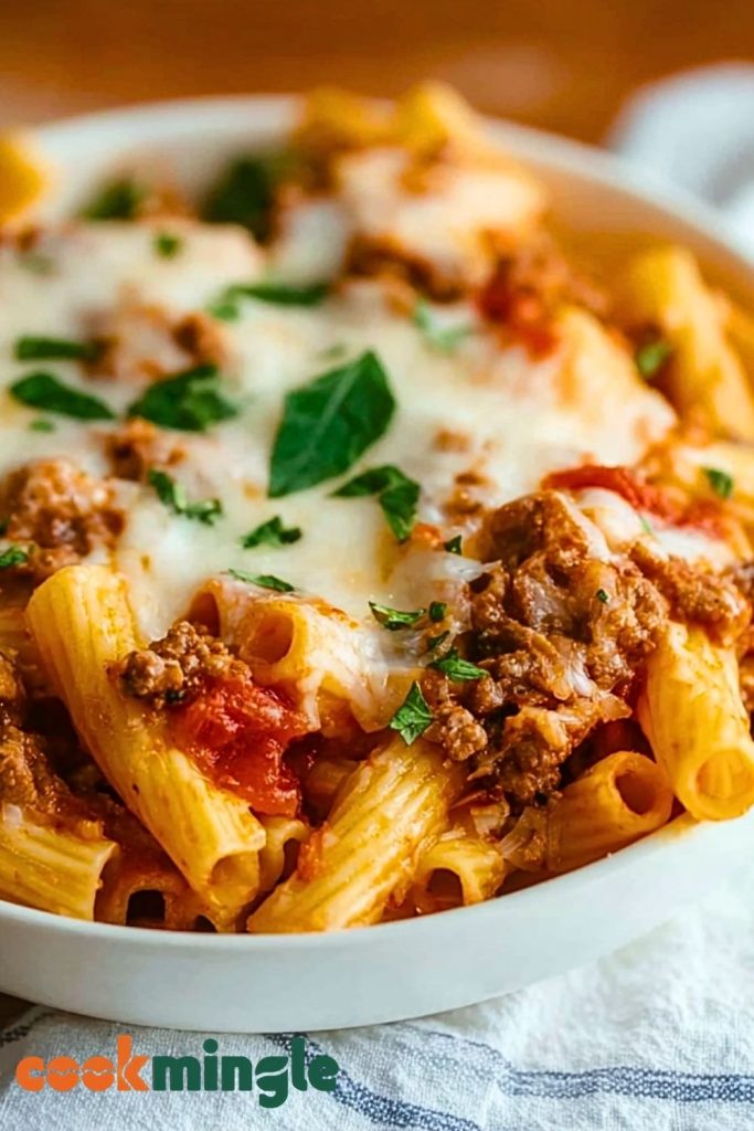 For best results, cook your rigatoni just until al dente; it will continue cooking in the oven, and overcooked pasta turns mushy. When preparing the meat sauce, let it simmer for at least 10 minutes to deepen the flavor. Use freshly shredded mozzarella instead of pre-packaged for better melt and taste. Grease your baking dish lightly to prevent sticking and make cleanup easier. If you want a golden top, remove the foil in the last 10 minutes of baking. And finally, let the bake rest for 5–10 minutes before serving so the layers can set and slice neatly.
