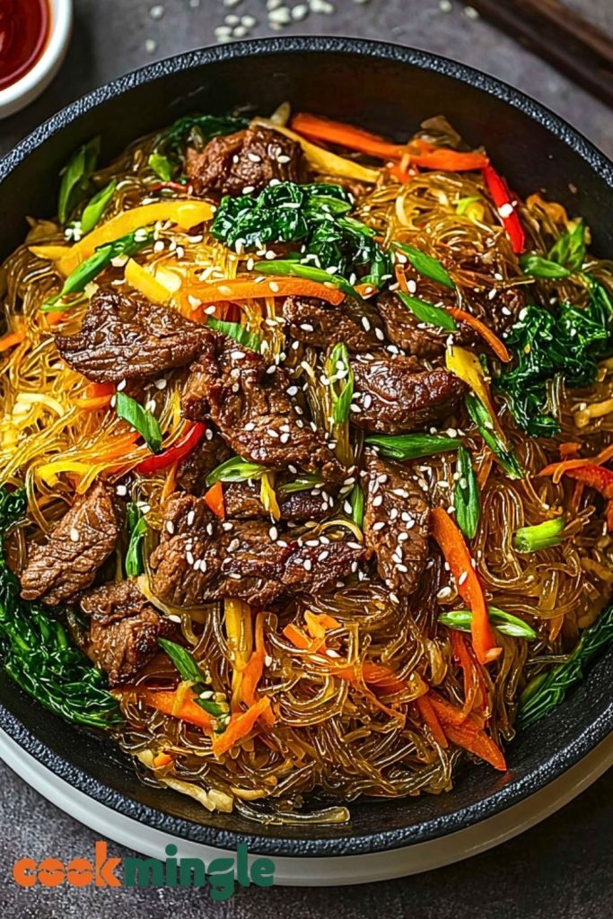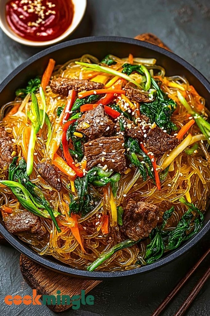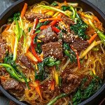 Keywords: japchae, glass noodles, Korean noodles, quick dinner, easy recipe, gluten-free, healthy, beef stir-fry