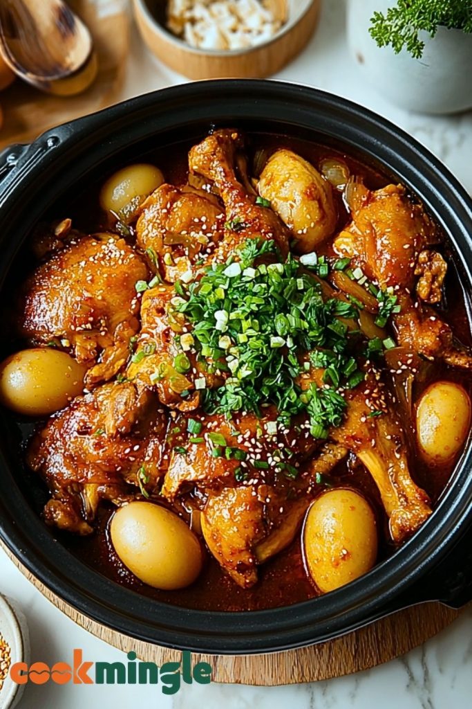 A bold, comforting Korean dish, **Jjimdak Korean Braised Chicken** blends tender chicken, soft vegetables, and a rich soy-based sauce with just the right amount of heat. Perfect for a cozy dinner or weekend gathering, this one-pot meal brings classic Korean flavors to your kitchen. With ingredients like garlic, soy sauce, and sesame oil, it’s one of those easy dinner ideas that checks every box—savory, slightly sweet, and deeply satisfying. Whether you’re after a quick dinner, healthy snack idea, or new food ideas, Jjimdak delivers a well-rounded, flavorful experience.