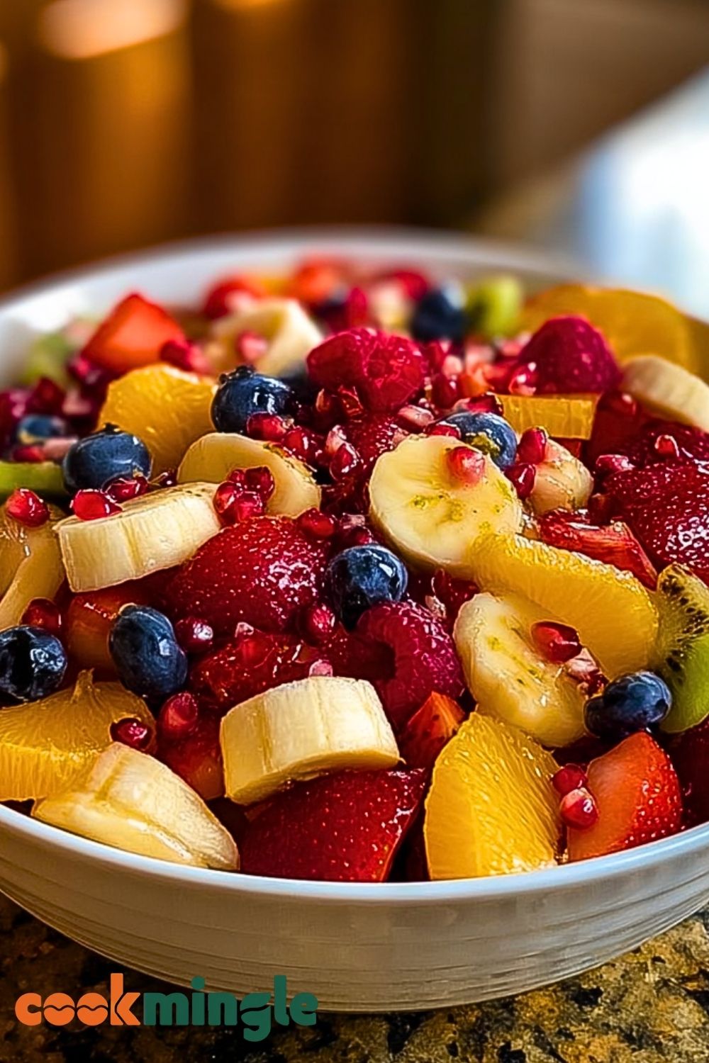 Slice the bananas into rounds, the strawberries into halves or quarters, and the orange into clean segments. Add them to a large serving bowl along with the blueberries, raspberries, apple chunks, and pomegranate seeds.