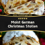 This Moist German Christmas Stollen brings old-world tradition right into your kitchen with its rich texture, festive flavors, and unforgettable aroma. Whether you’re gifting it or keeping it for cozy family breakfasts, it’s a recipe that truly captures the spirit of the holidays. With soaked fruits, buttery dough, and that classic sugar-dusted top, this stollen proves that homemade always tastes better—and it lasts long enough to savor well past Christmas morning.