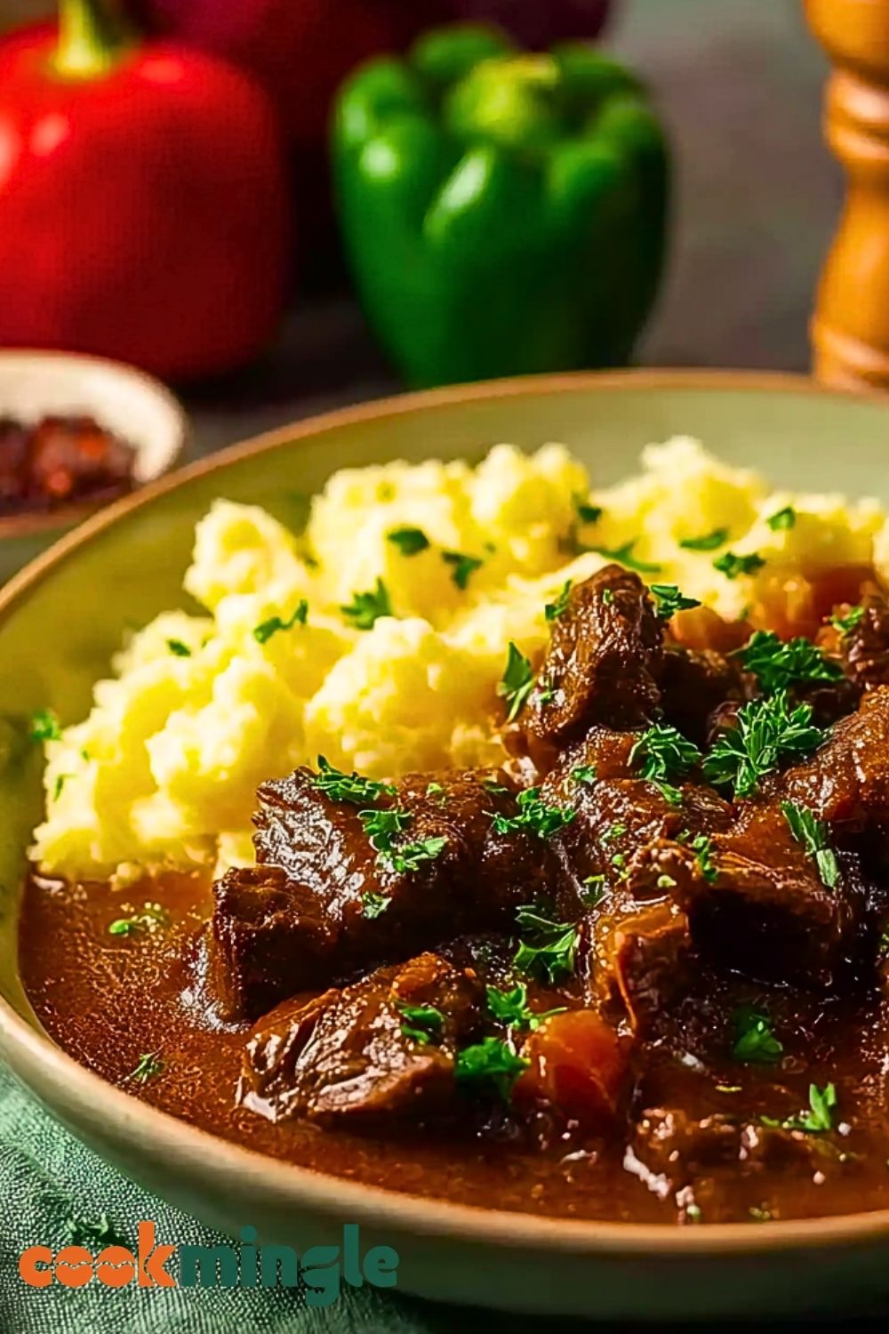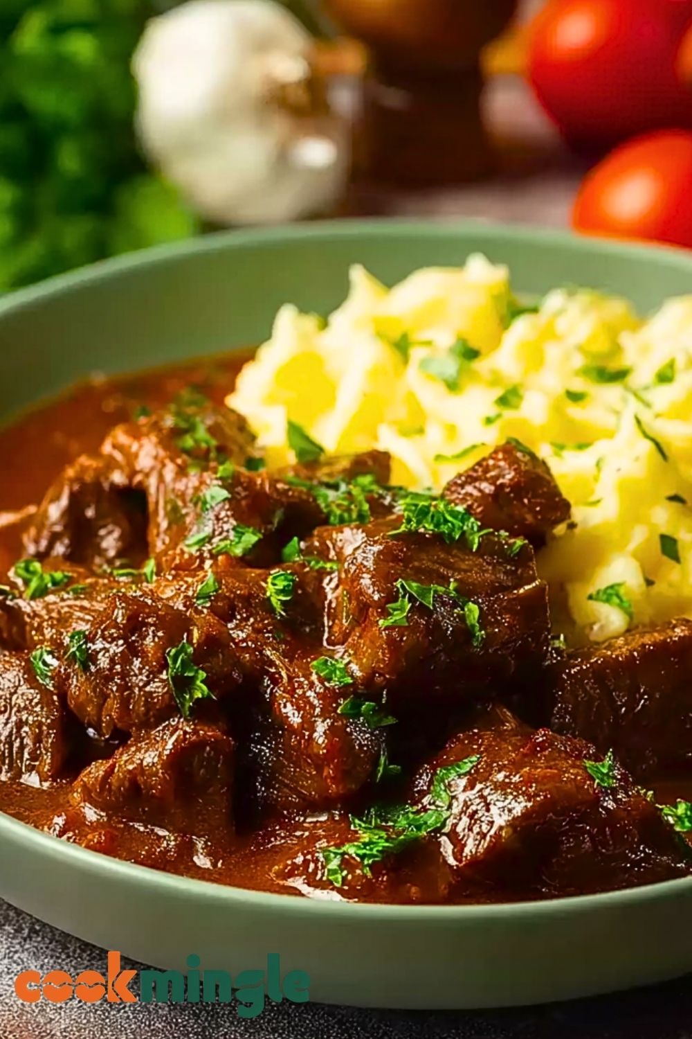 Creamy and rich mashed potatoes are the ultimate base for soaking up the saucy goulash.