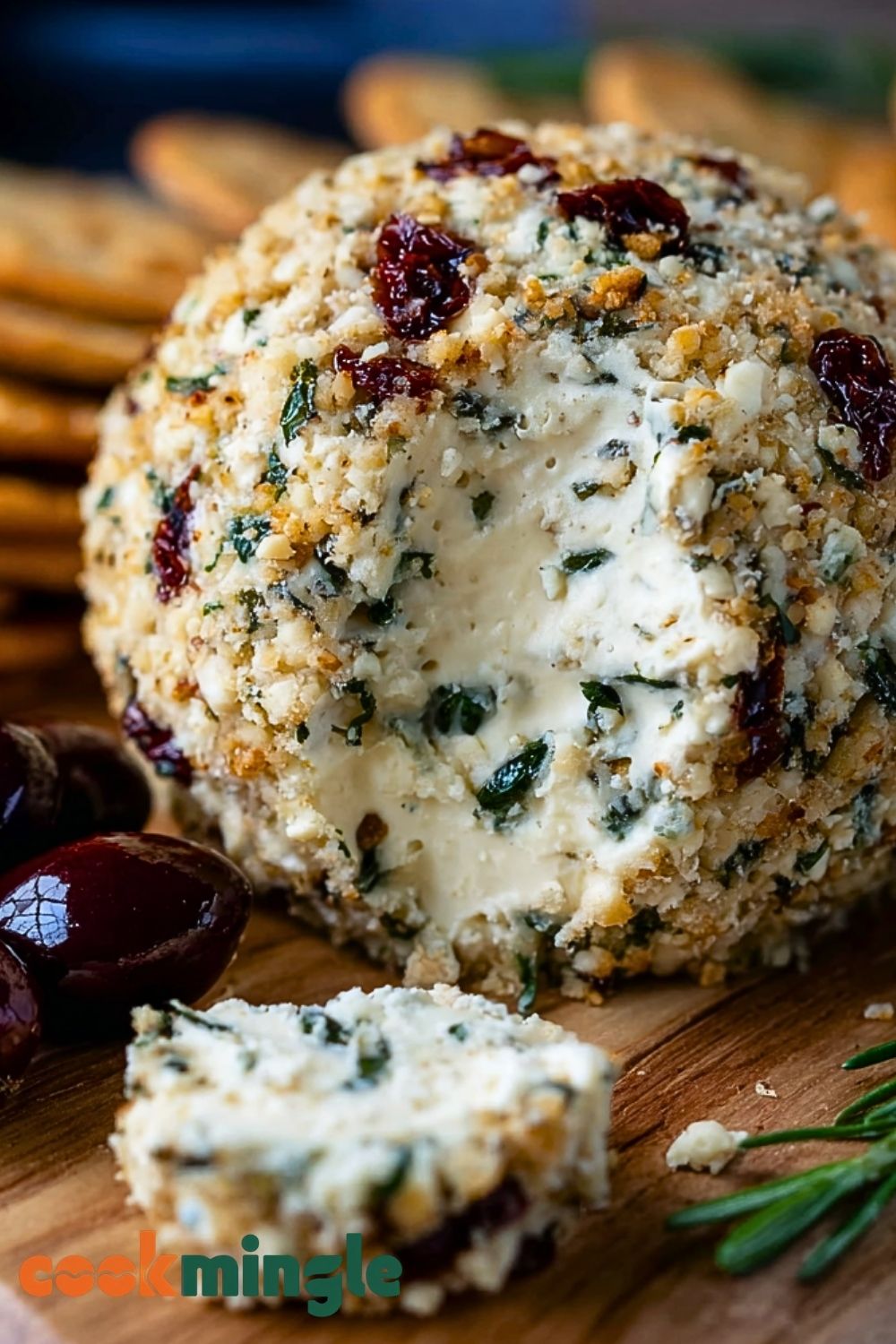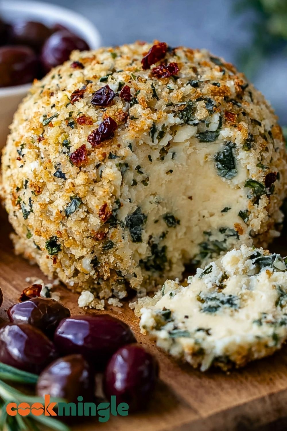 Place the finished cheese ball on a serving board with crackers, crostini, or veggie sticks. Garnish with a few extra sprigs of rosemary or olives for a polished look.