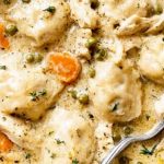 Once dumplings are cooked, gently stir in the heavy cream and frozen peas. Let it simmer uncovered for another 5 minutes. Taste and adjust seasoning with salt and pepper if needed.