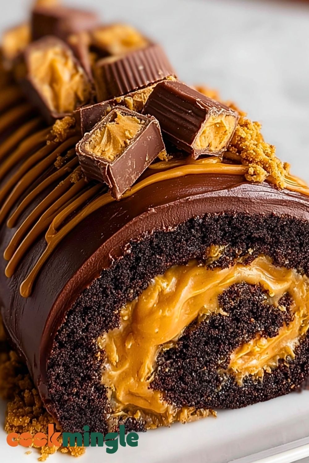 Drizzle the ganache over the rolled cake. Top with halved mini peanut butter cups and crushed graham crackers or cookies for crunch. Chill for 20-30 minutes to set before slicing.