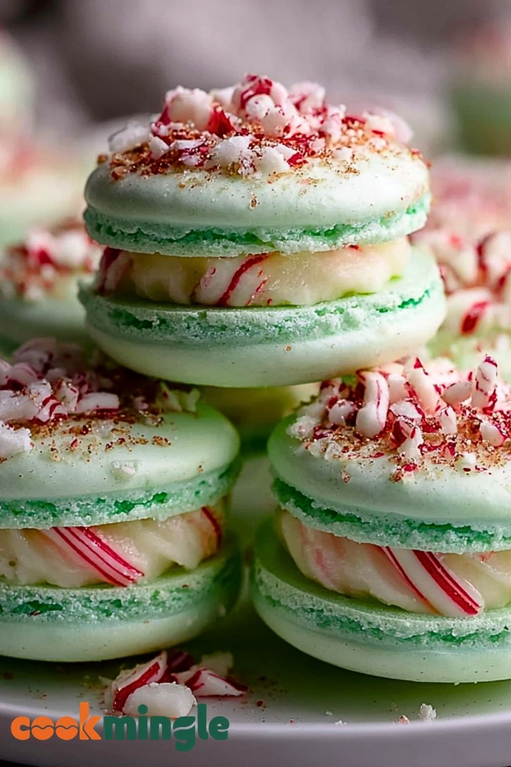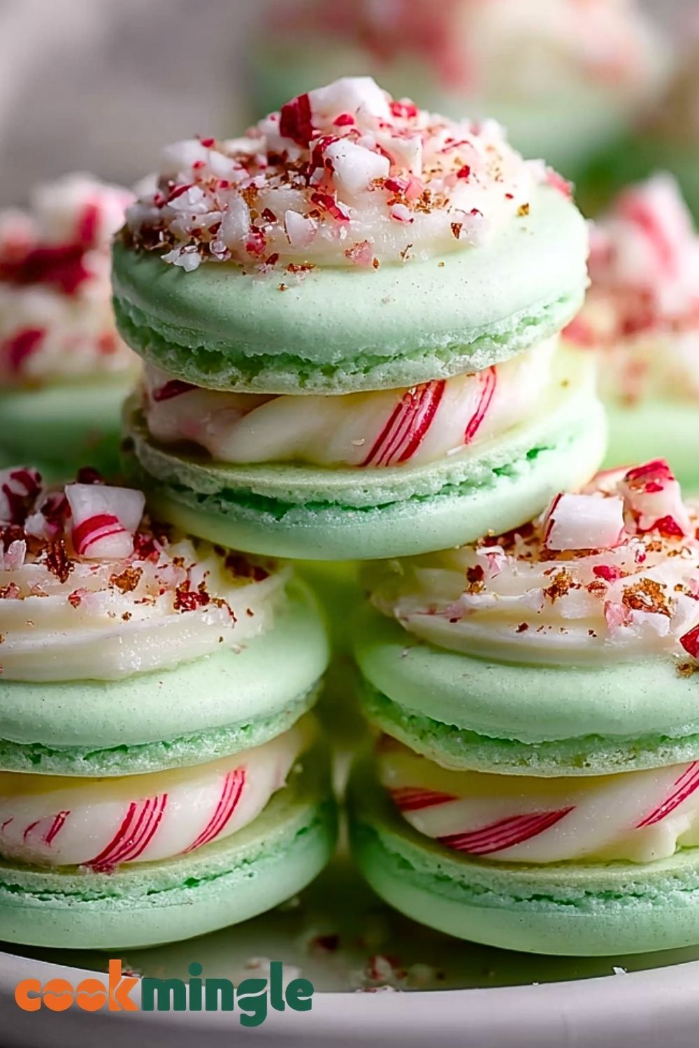 Sprinkle crushed peppermint candy on top or roll the edges in it for extra texture. Place assembled macarons in an airtight container and refrigerate for 24 hours. This maturation process enhances flavor and texture, making them perfectly soft inside.