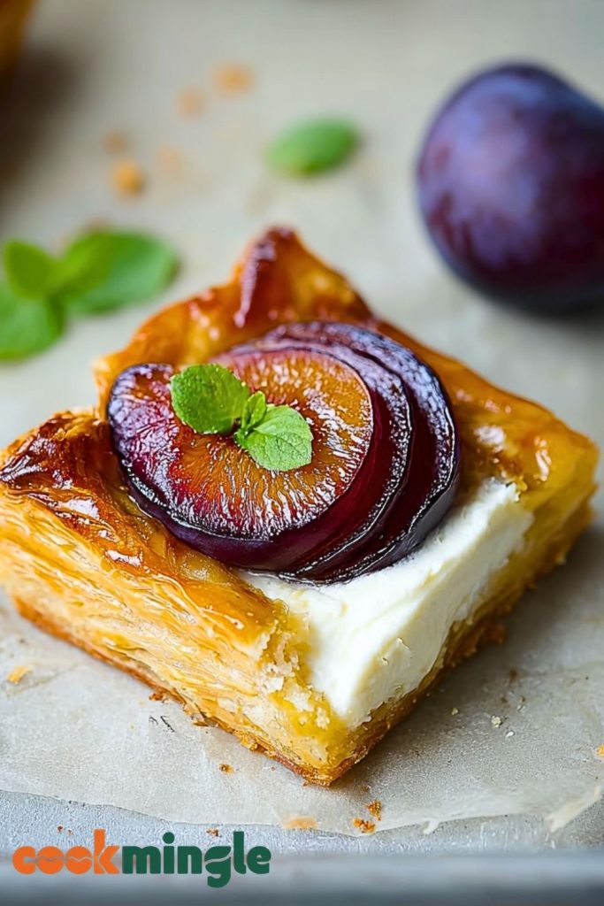 Prep Time: The total prep time is about 15–20 minutes. That includes rolling and scoring the puff pastry, mixing the cheese filling, and slicing the plums. If you’re using pre-sliced plums or already softened cream cheese, you can shave off a few minutes.