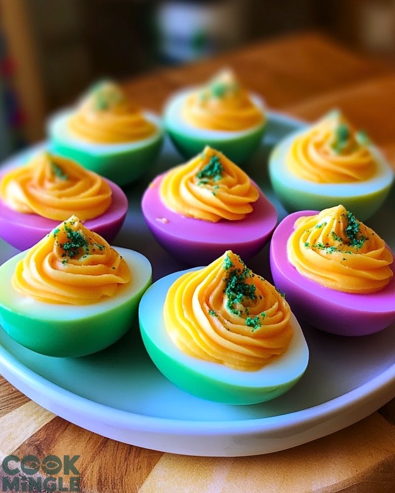 This dish transforms an ordinary egg into a canvas for creativity. Using natural or gel-based food coloring, the whites are dyed into pastel shades of pink, teal, yellow, and purple before being filled with a rich and zesty yolk mixture. They’re just as fun to make as they are to serve and eat — a great kitchen activity for families or a quick way to brighten up any menu.